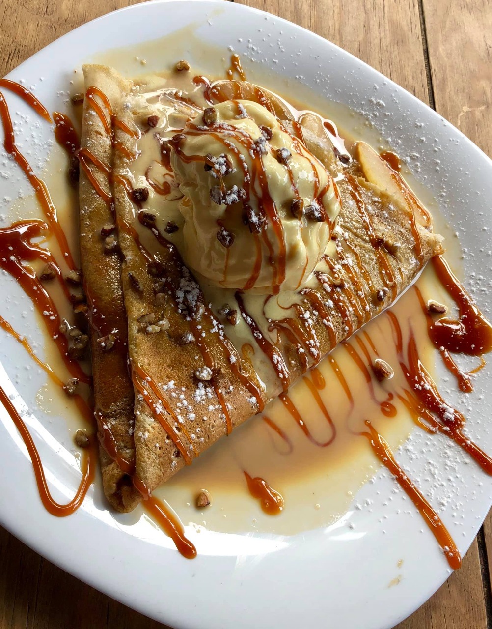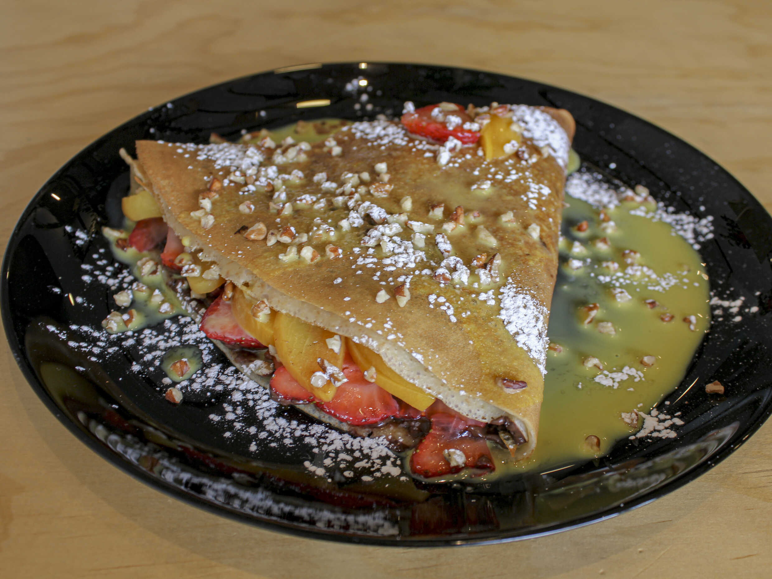 Exquisita crepa bañada en rompope con fresas frescas, nuez durazno y como base chocolate Carlos V