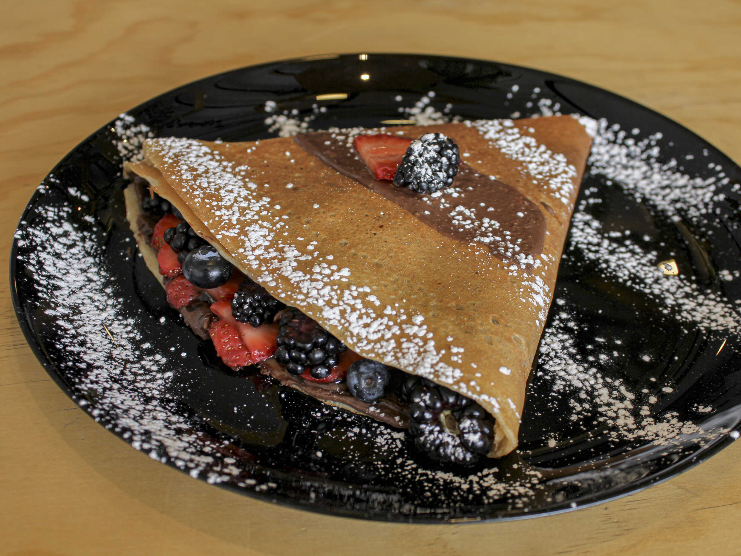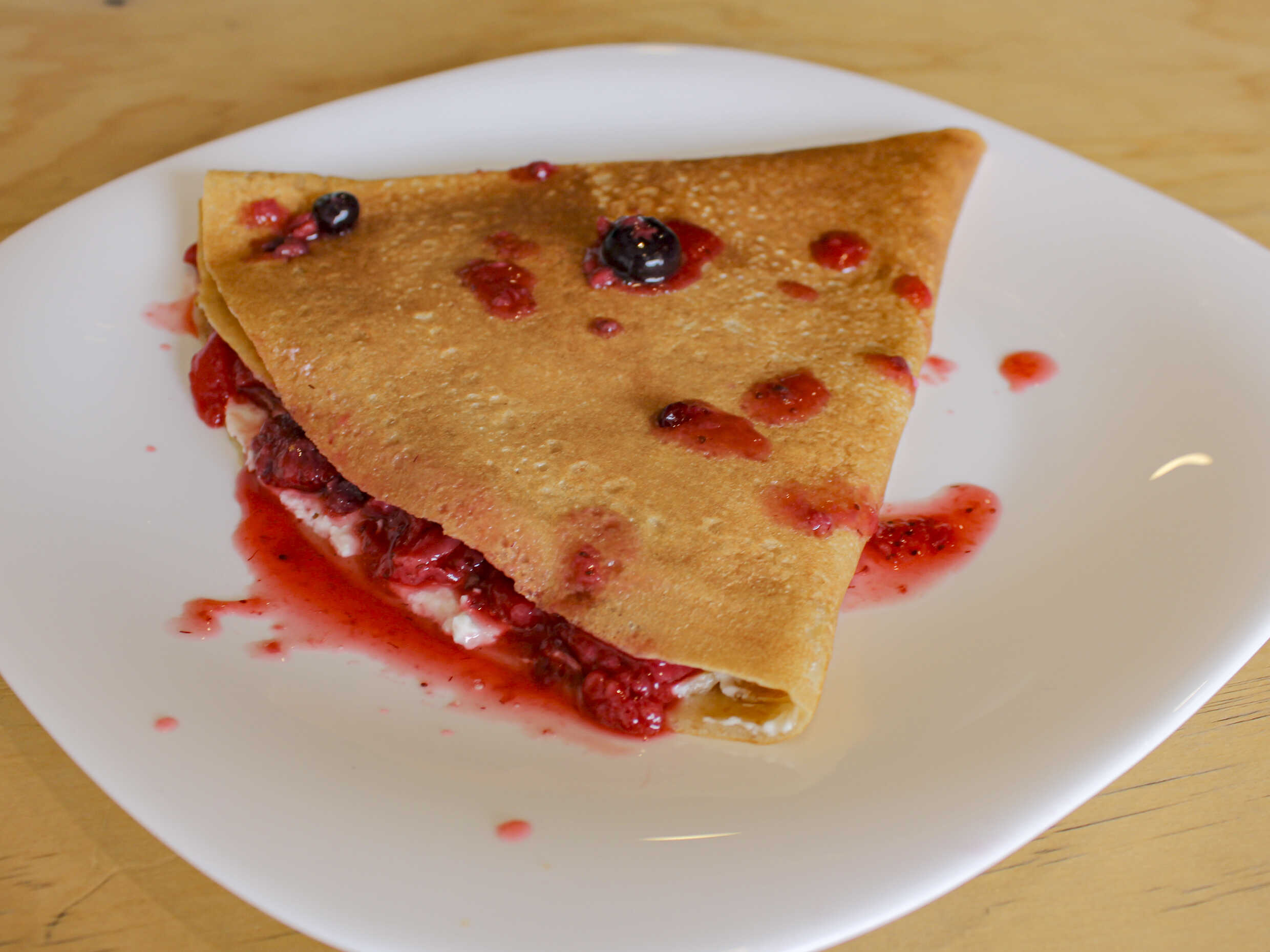 Base de mermelada de fresa o zarzamora al gusto, con una exquisita rebanada de pay de queso dentro de la crepa.