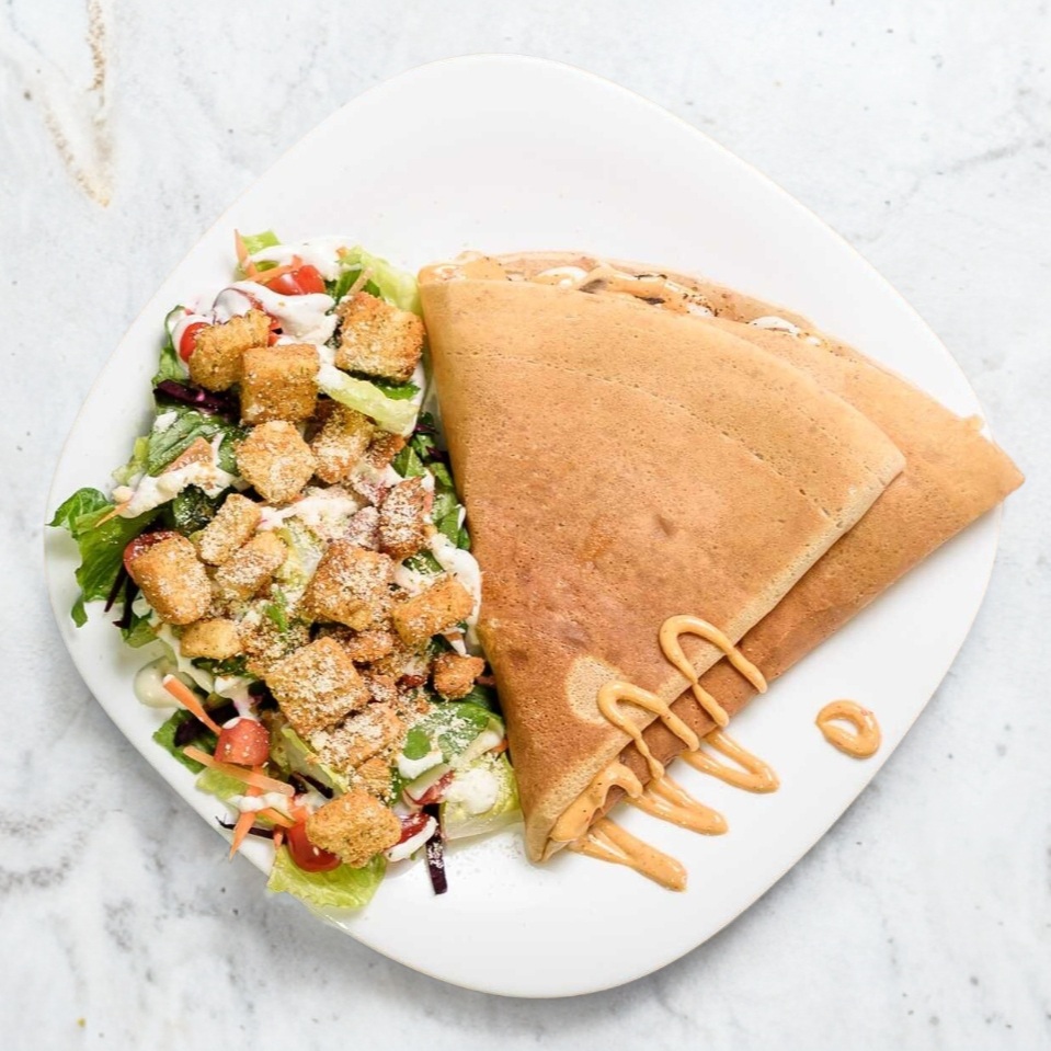 Todas nuestras crepas vienen con aderezo chipotle y pimienta. Agrega a tu crepa una deliciosa ensalada compuesta por lechuga orejona, tomate cherry, zanahoria y betabel, con aderezo ranch, crotones y queso parmesano.