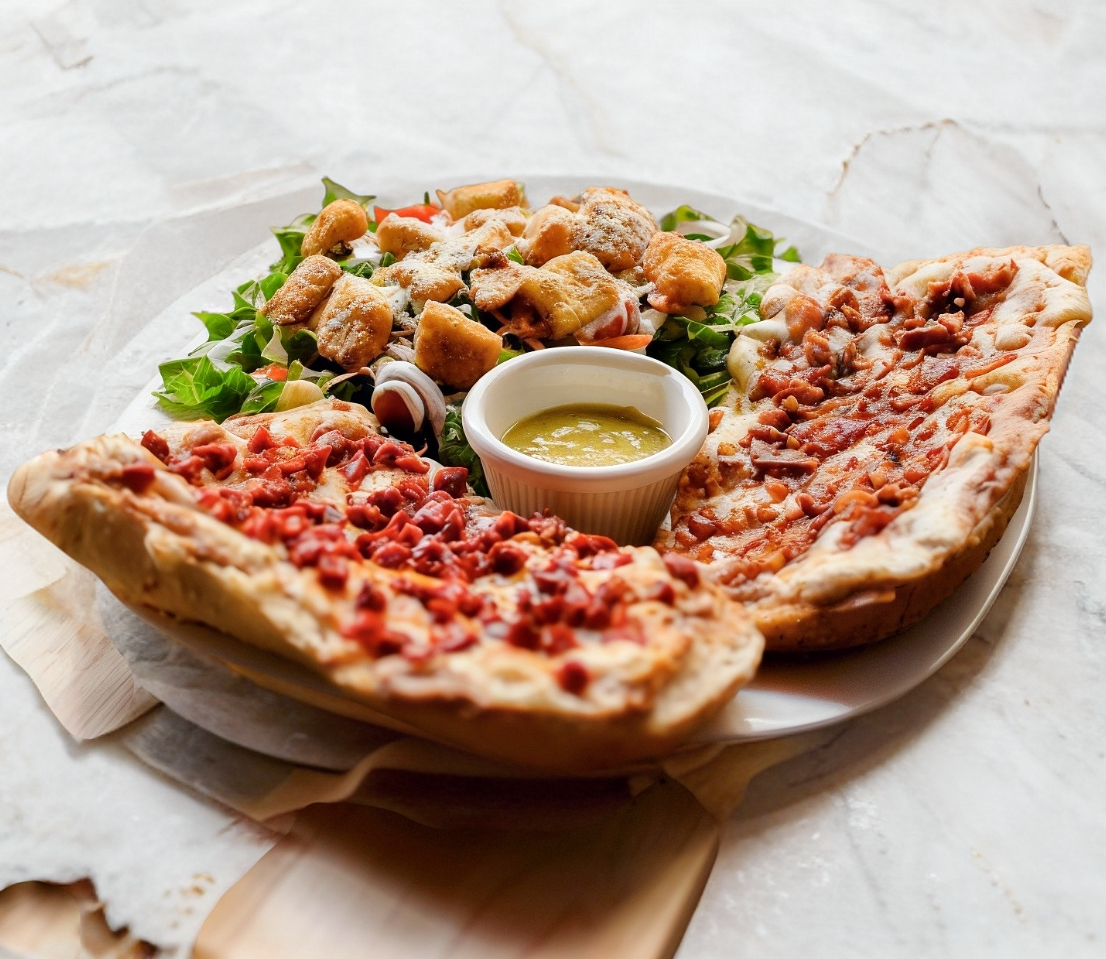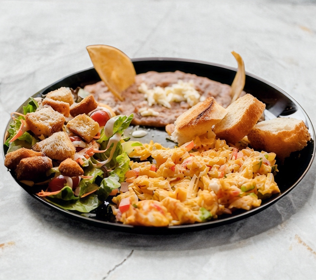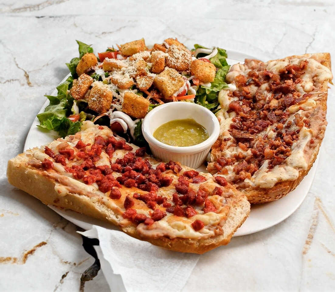 Delicioso baguette calientito con frijoles, queso manchego fresco y trocitos de tocino ahumado, van acompañados de nuestra exquisita ensalada italiana.