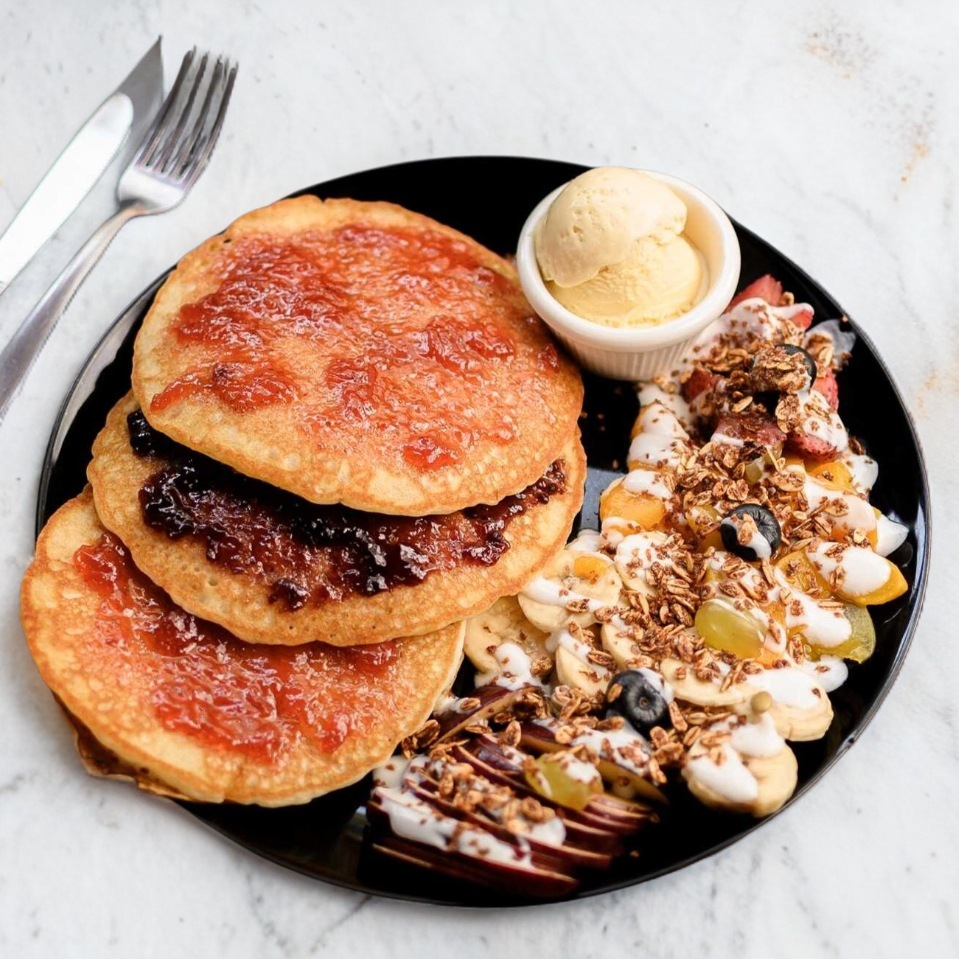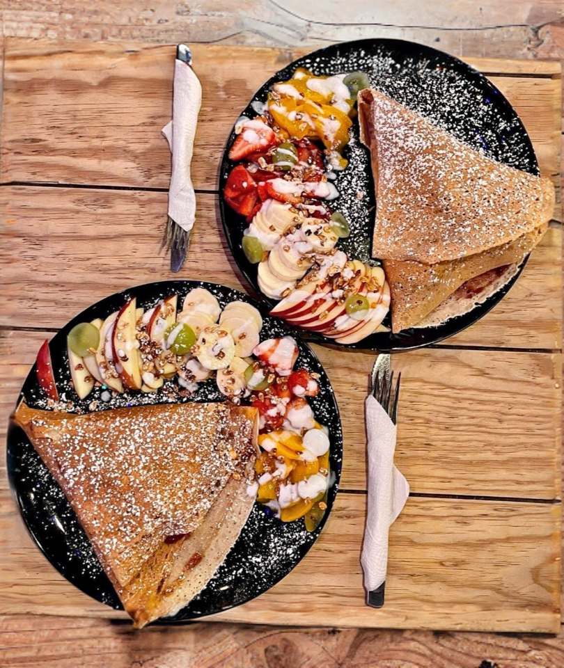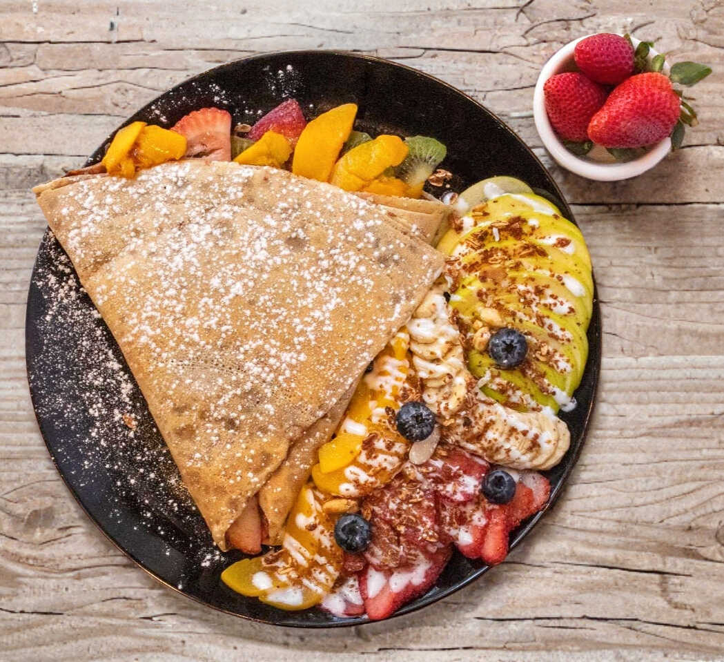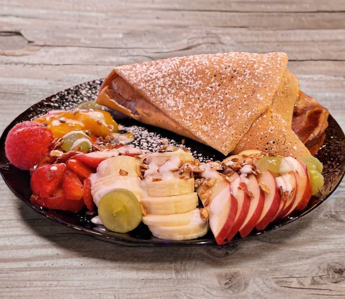 Agrega a tu crepa una deliciosa ensalada de frutas compuesta por manzana, plátano, fresa, durazno, uva, mora azul natural como aderezo yogurt natural y granola como cereal.