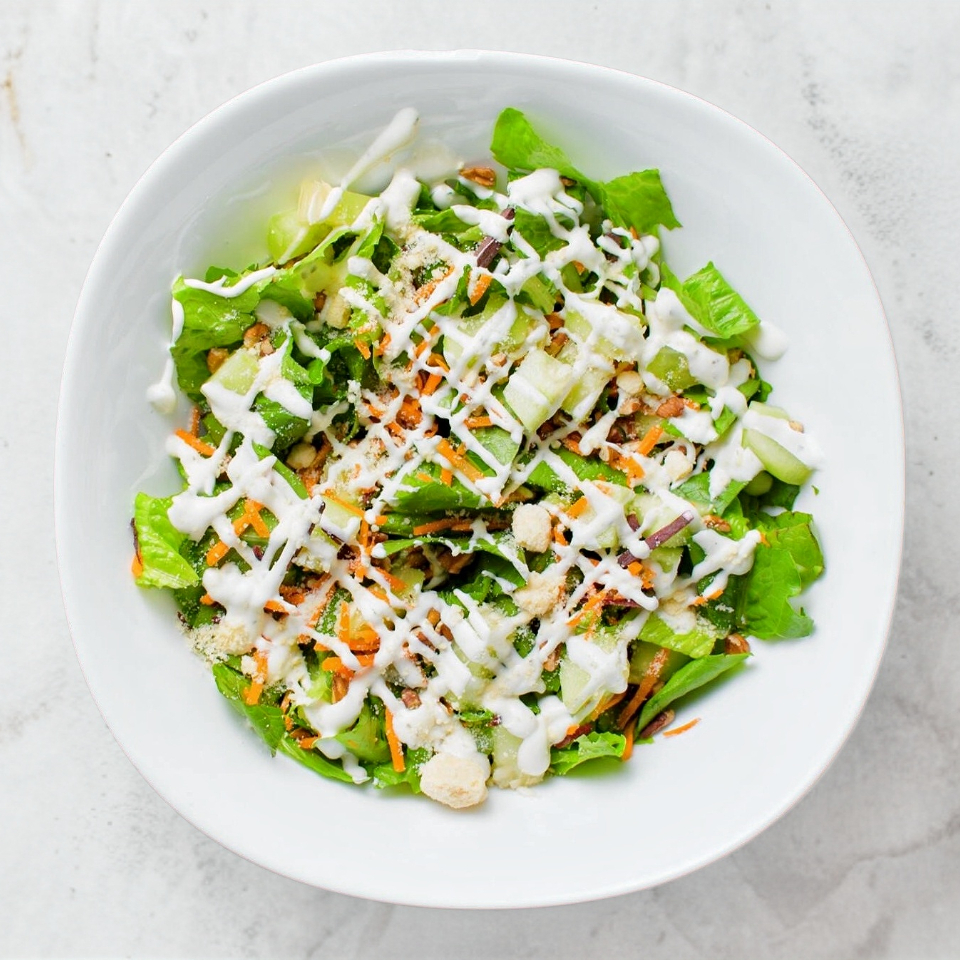 Mezcla de lechuga orejona con espinacas, nuez, tomate cherry, pepino, zanahoria, aderezo ranch y queso parmesano.