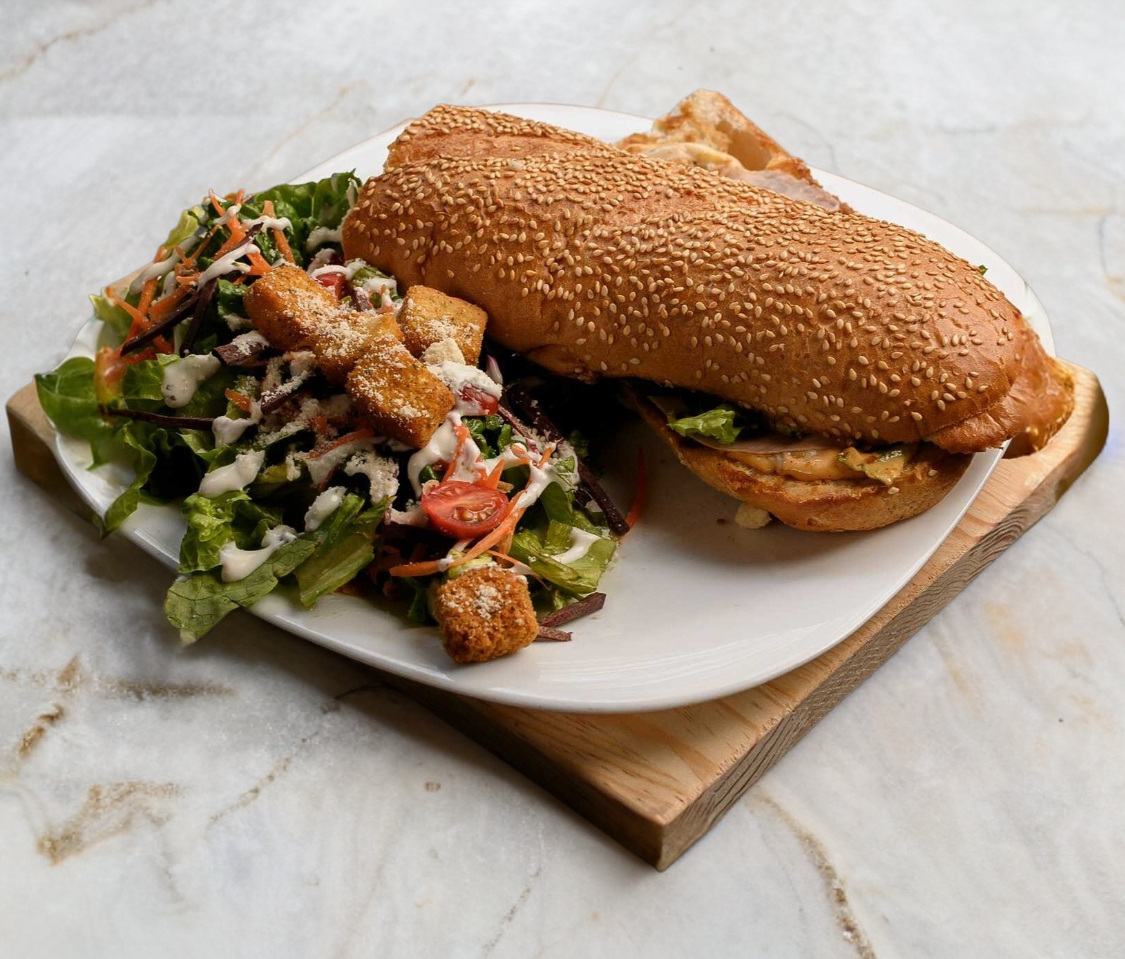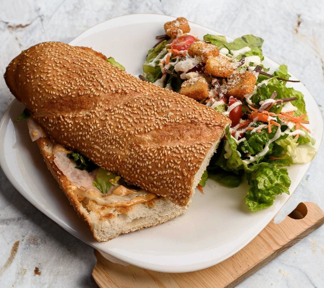 Sabroso baguette calientito relleno de pechuga de pavo ahumad, queso manchego fresco, jitomate, lechuga orejona, pimiento morrón y aderezo de chipotle, acompañada de nuestra tradicional ensalada italiana.