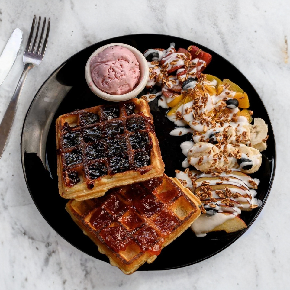 Acompañados de una deliciosa ensalada de frutas y bola de helado.