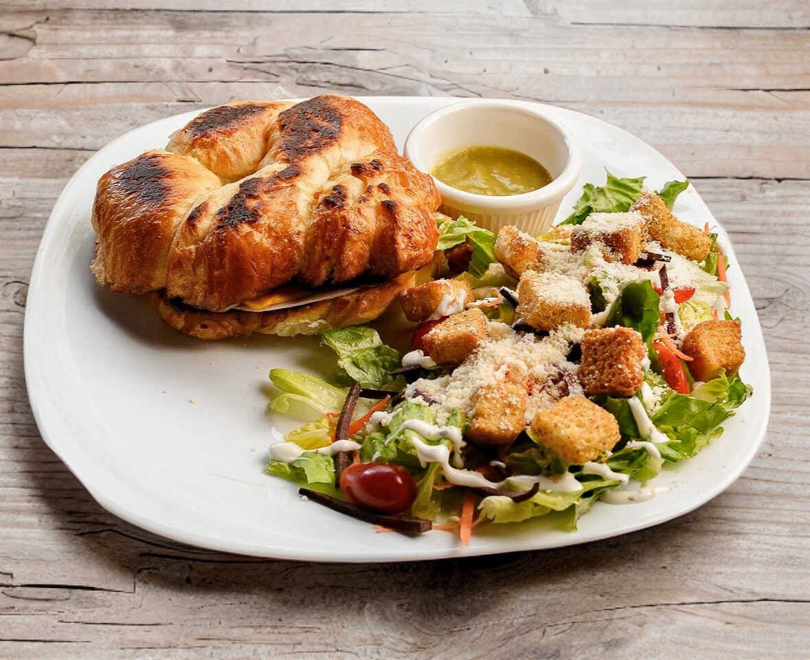 Exquisito cuernito relleno con pechuga de pavo, queso manchego, lechuga orejona, pimiento morro, jitomate y queso amarillo, acompañado de nuestra exquisita ensalada italiana.