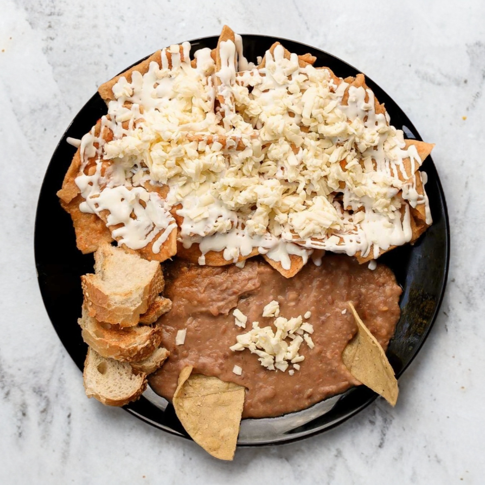 Exquisitos chilaquiles bañados en la salsa de tu preferencia, acompañados de frijoles refritos, crema, queso manchego, huevito y si deseas agrega proteína al gusto.