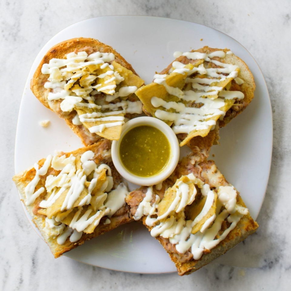 Delicioso baguette calientito con frijoles y exquisitos chilaquiles bañados en salsa ver (están un poquito picosos)