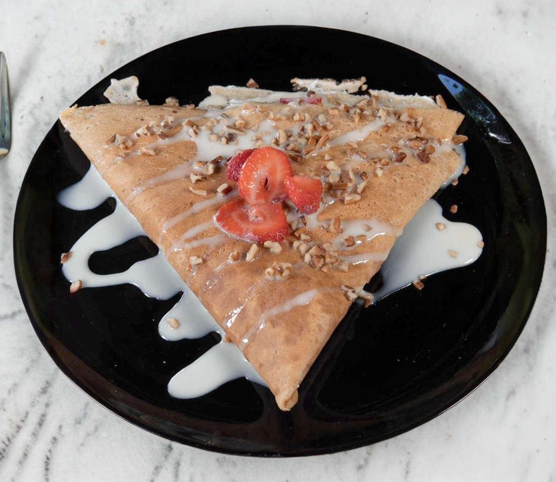 Exquisita crepa bañada en rompope con fresas frescas, nuez durazno y como base chocolate Carlos V