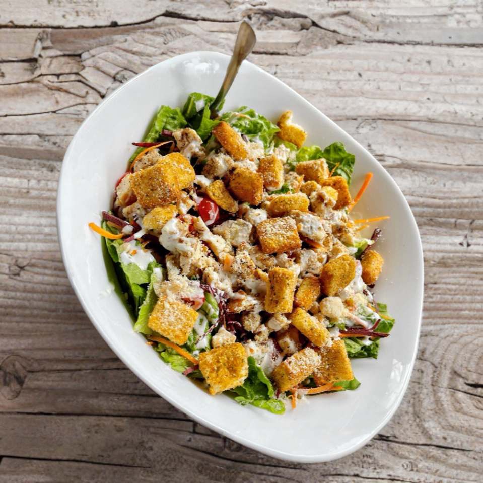 Lechuga orejona fresca con zanahoria, tomate cherry, betabel, tiras de pechuga de pollo, queso parmesano, aderezo ranch y crotones.