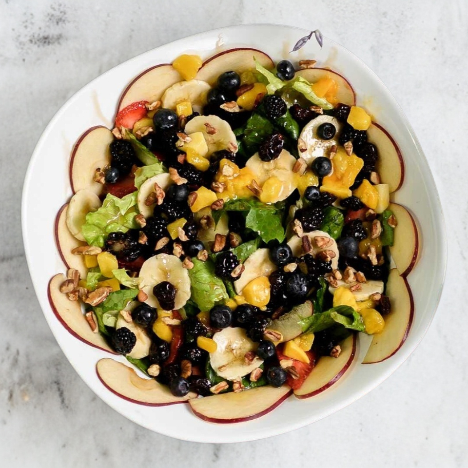 Lechuga orejona fresca con una mezcla de frutas compuesta por fresa, plátano, manzana, mora azul, zarzamora, arándanos, nuez y como aderezo miel maple.