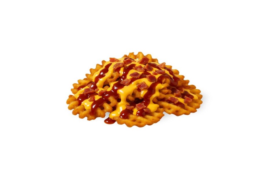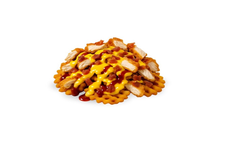 PAPAS WAFFLE SAZONADAS (200 G), CON POLLO FRITO (90 G), SALSA DE QUESO CHEDDAR, TROCITOS DE TOCINO Y BBQ.