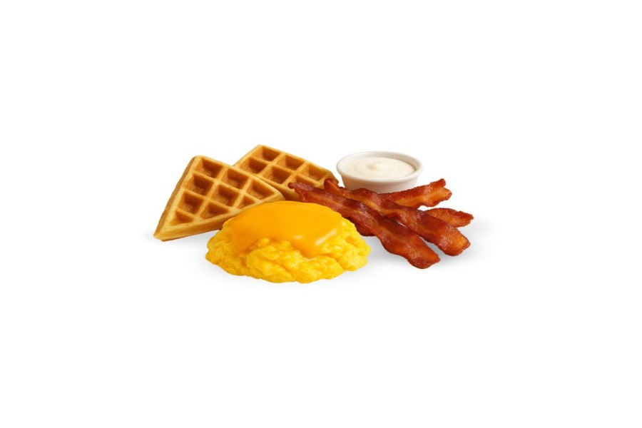 1/2 WAFFLE, TOCINO CRUJIENTE, HUEVO REVUELTO Y QUESO AMERICANO.