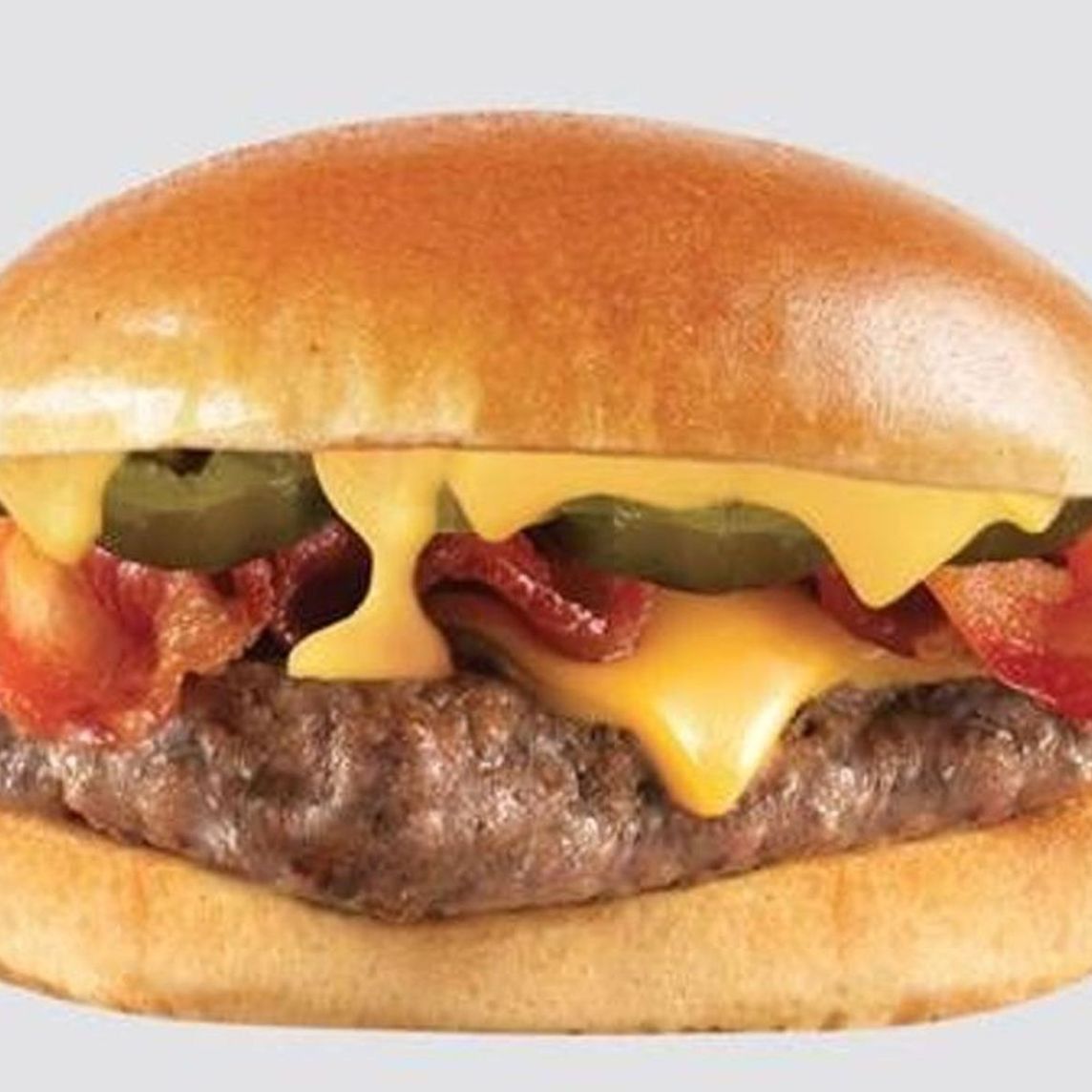 Dos cuartos de libra de jugosa carne 100% de res. Elaborada con una combinación de queso cheddar y jalapeños, cebollitas crujientes y tres tiras de tocino ahumado, todo entre un pan brioche tostado.