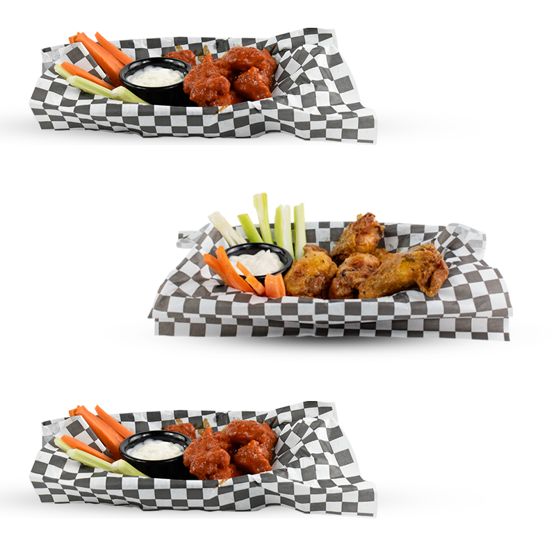 Alitas .900 kg con 3 salsas a elegir, acompañado de palitos de zanahoria y apio.
