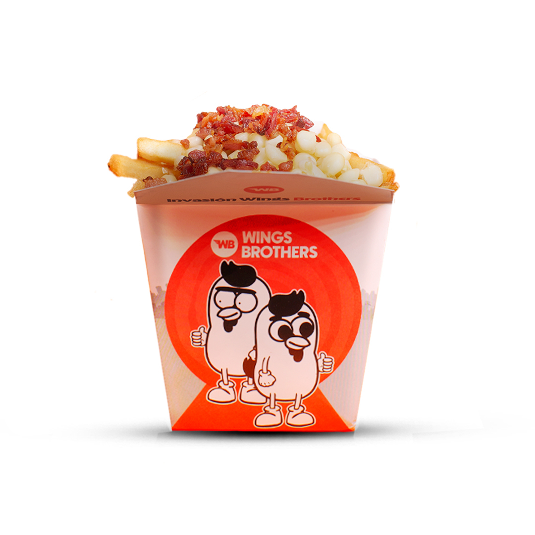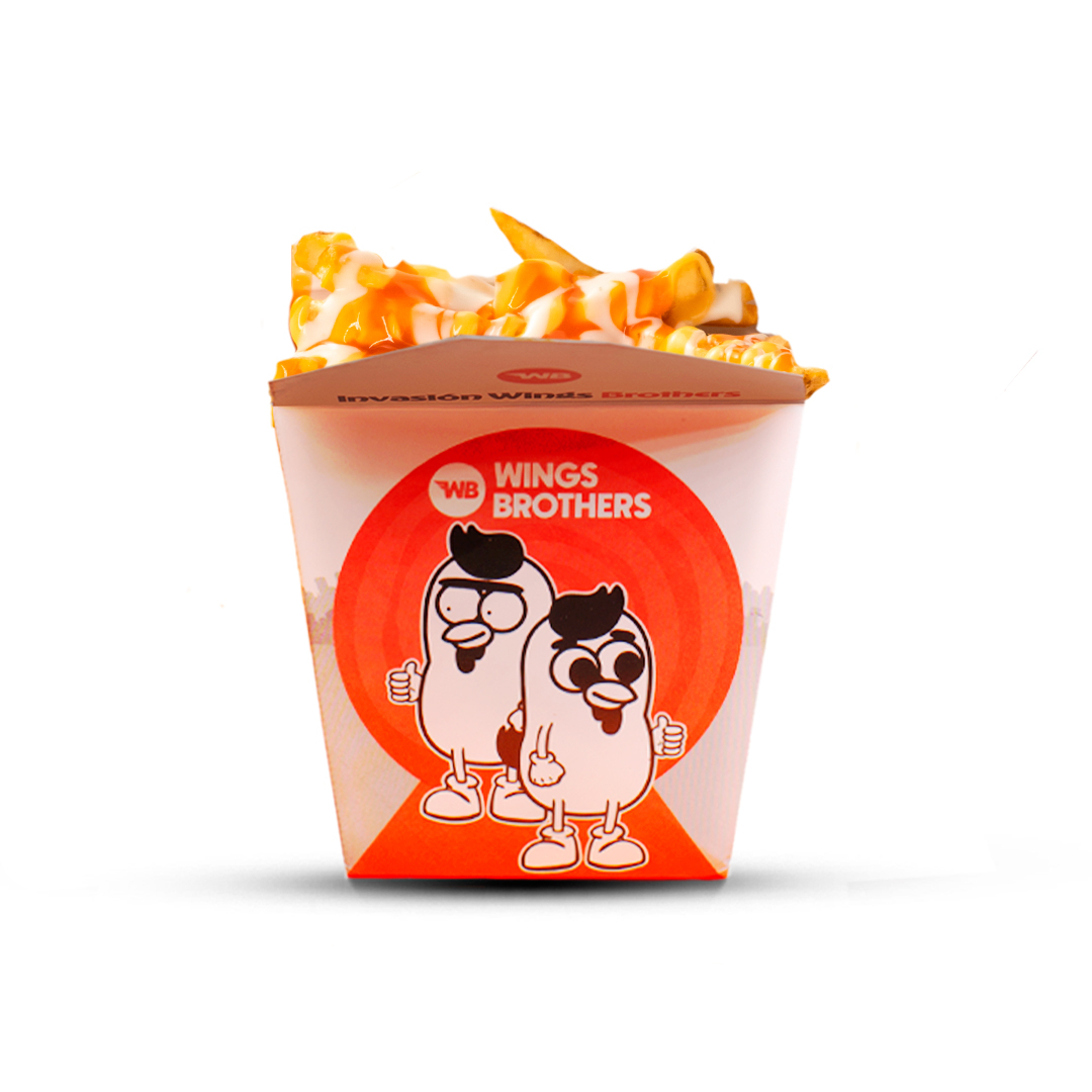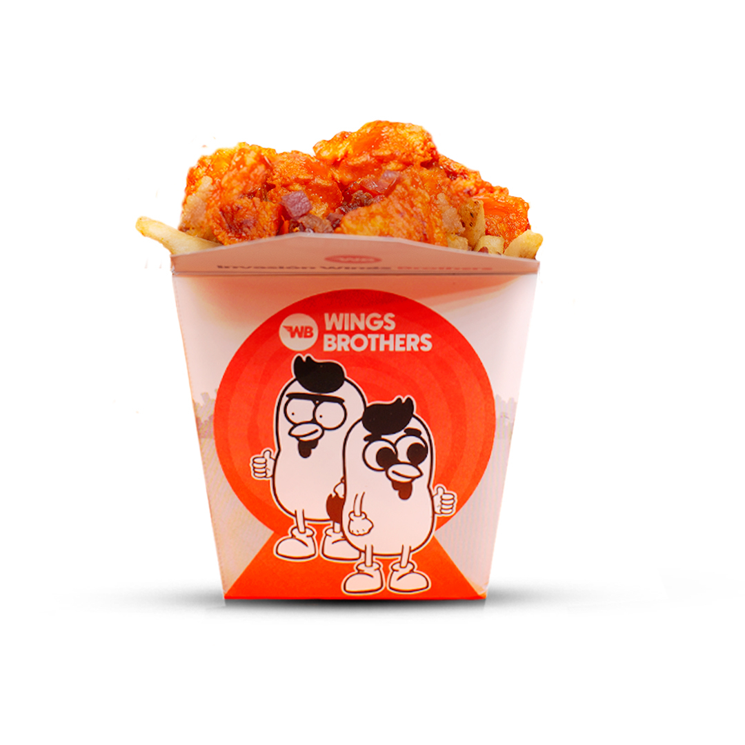 Nuestra deliciosa Box Brother cajita de papas con boneless bufalo bañados en queso amarillo, tocino y elote