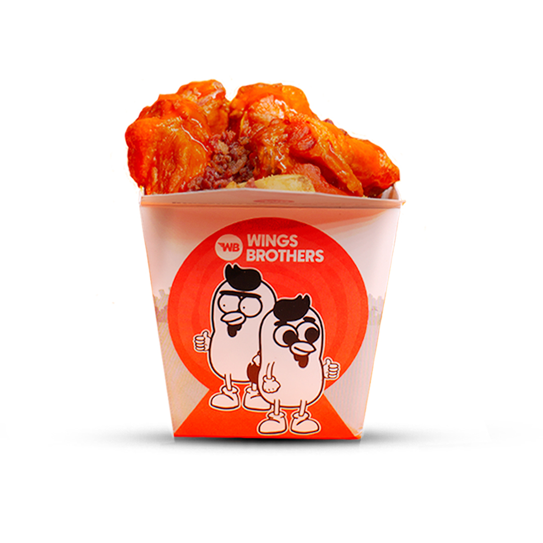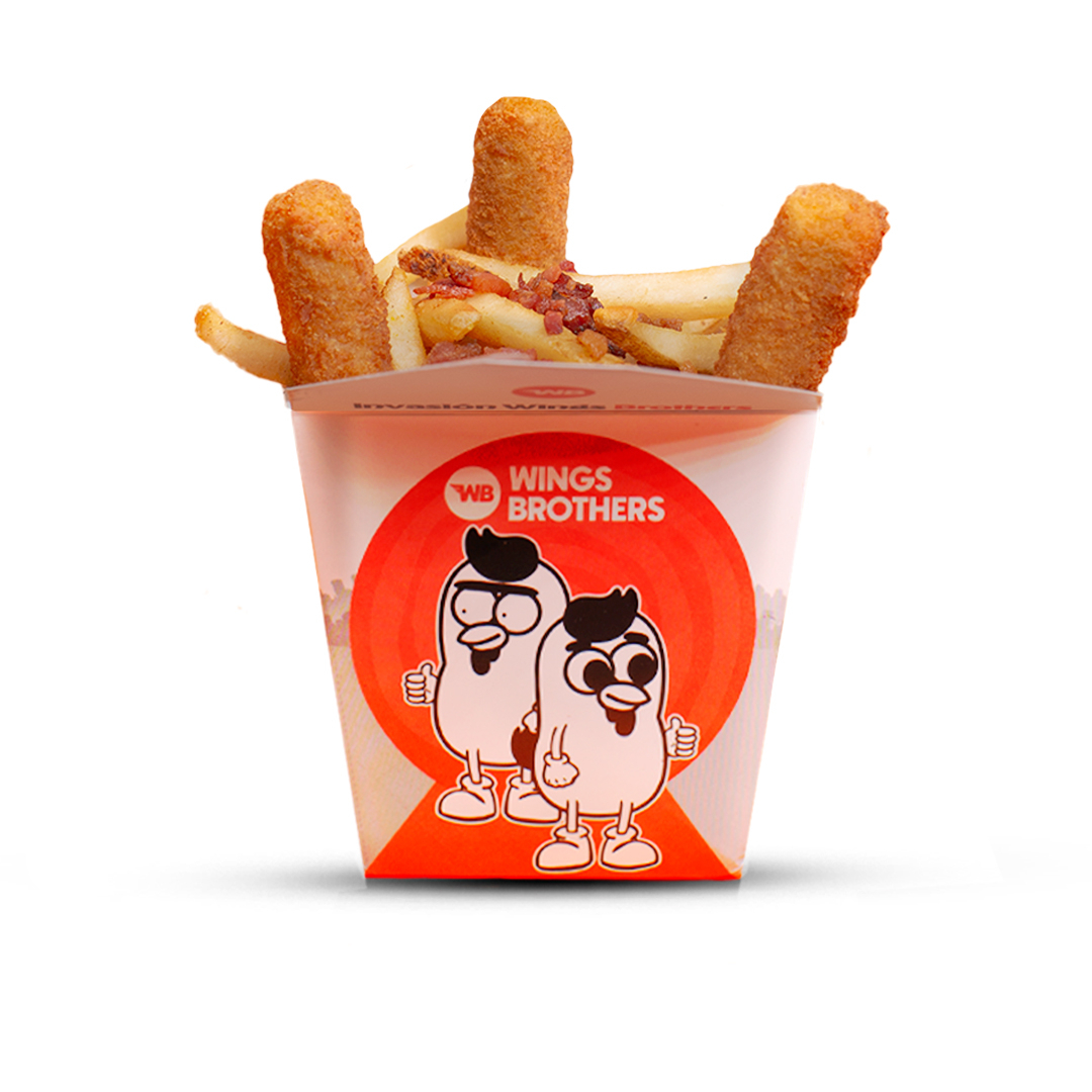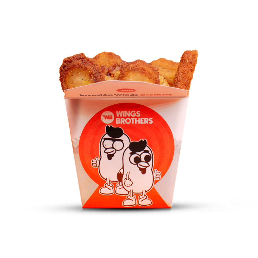 Nuestra deliciosa Box Brother cajita de papas con boneless bufalo bañados en queso amarillo, tocino y elote