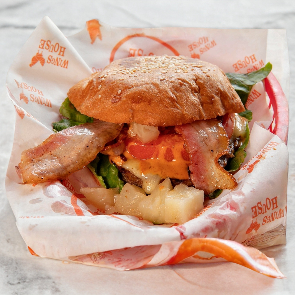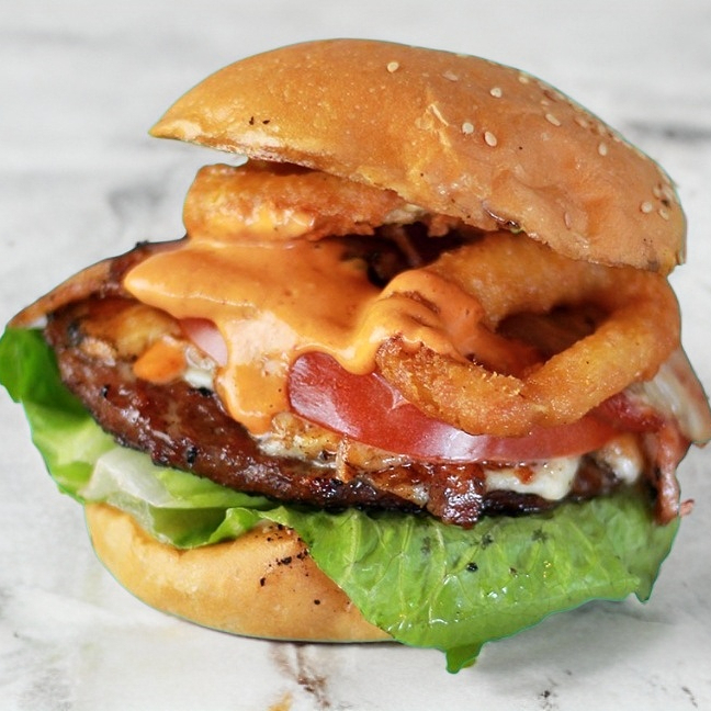 Pan casero, 150 gr de la mejor calidad de carne de sirloin, queso pepper jack, aros de cebolla, tiras de tocino, lechuga, jitomate y aderezo chipotle.