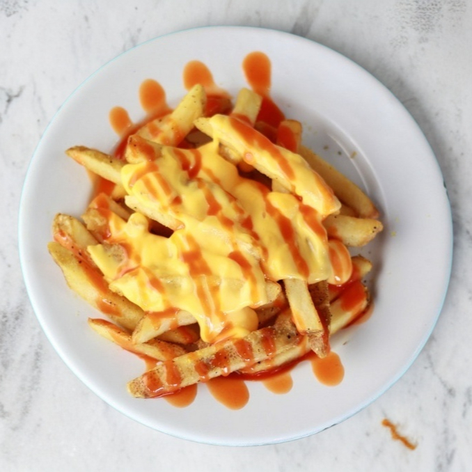 Papas a la francesa bañadas en nuestra salsa acid house mas queso cheddar.