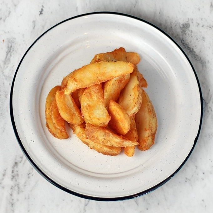 Papas, receta secreta, tocino marinado, cebolla caramelizada, queso americano y aderezo de la casa.