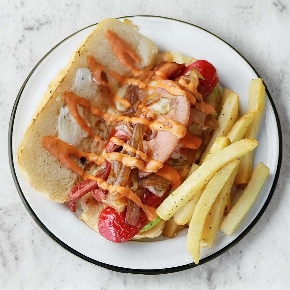 Pan casero, salchicha para asar, queso manchego y Philadelphia, tocino, cebolla caramelizada, mayonesa/cátsup y aderezo chipotle.