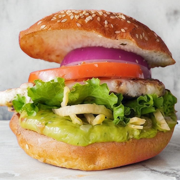 Pan casero, pechuga de pollo a la parrilla, guacamole, queso estilo pepper jack, tiras de tocino, cebolla morada, jitomate y aderezo chipotle.