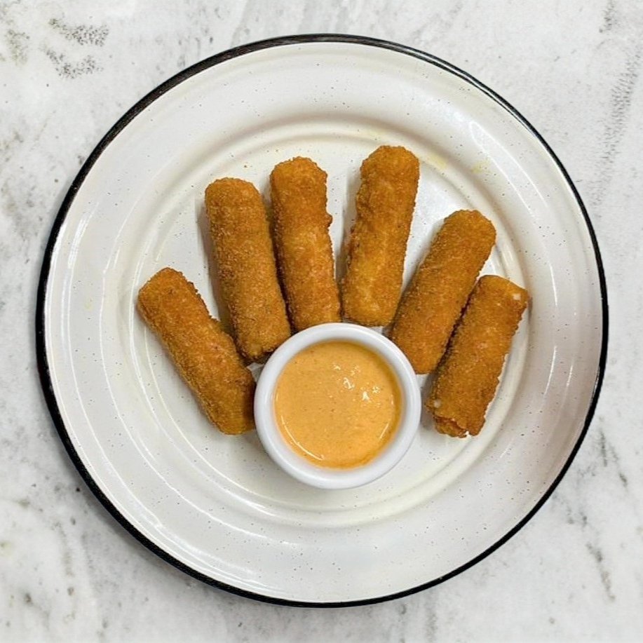 6 piezas. Palillos de queso mozzarella empanizados mas aderezo de la casa.