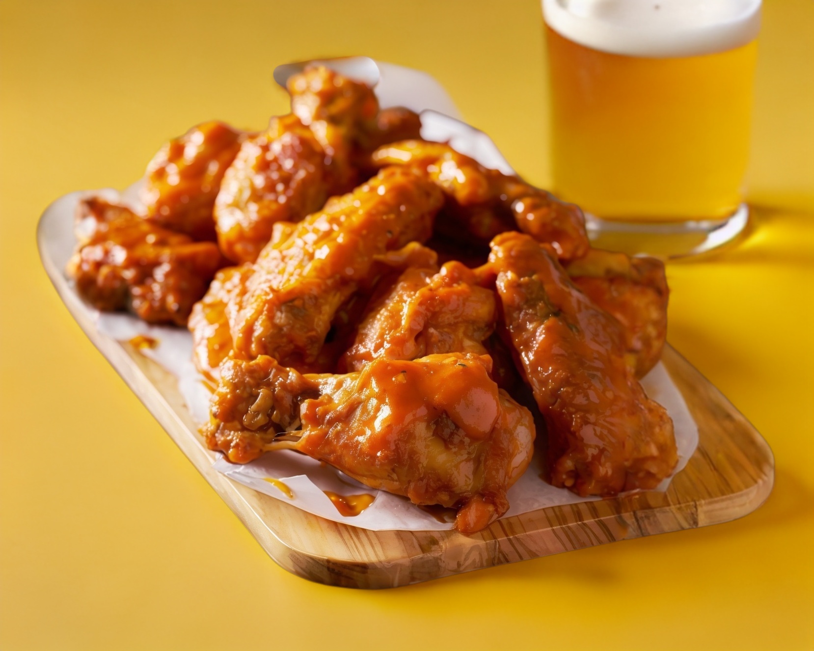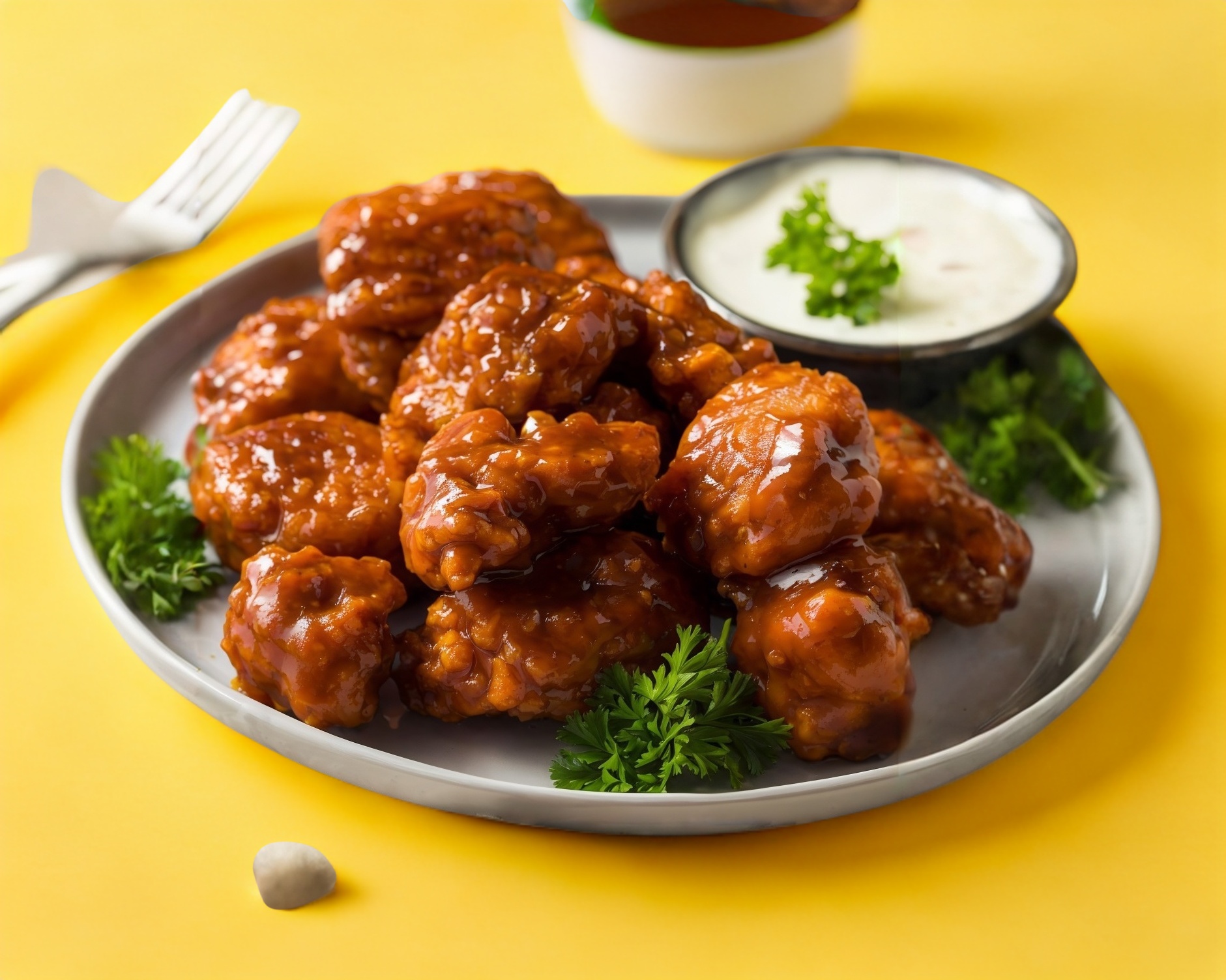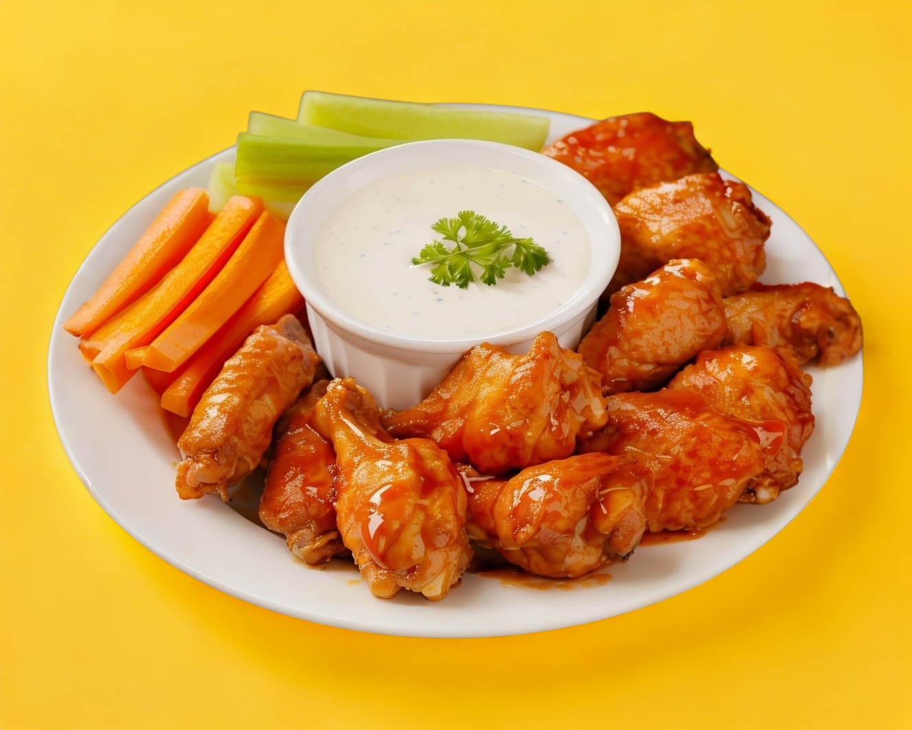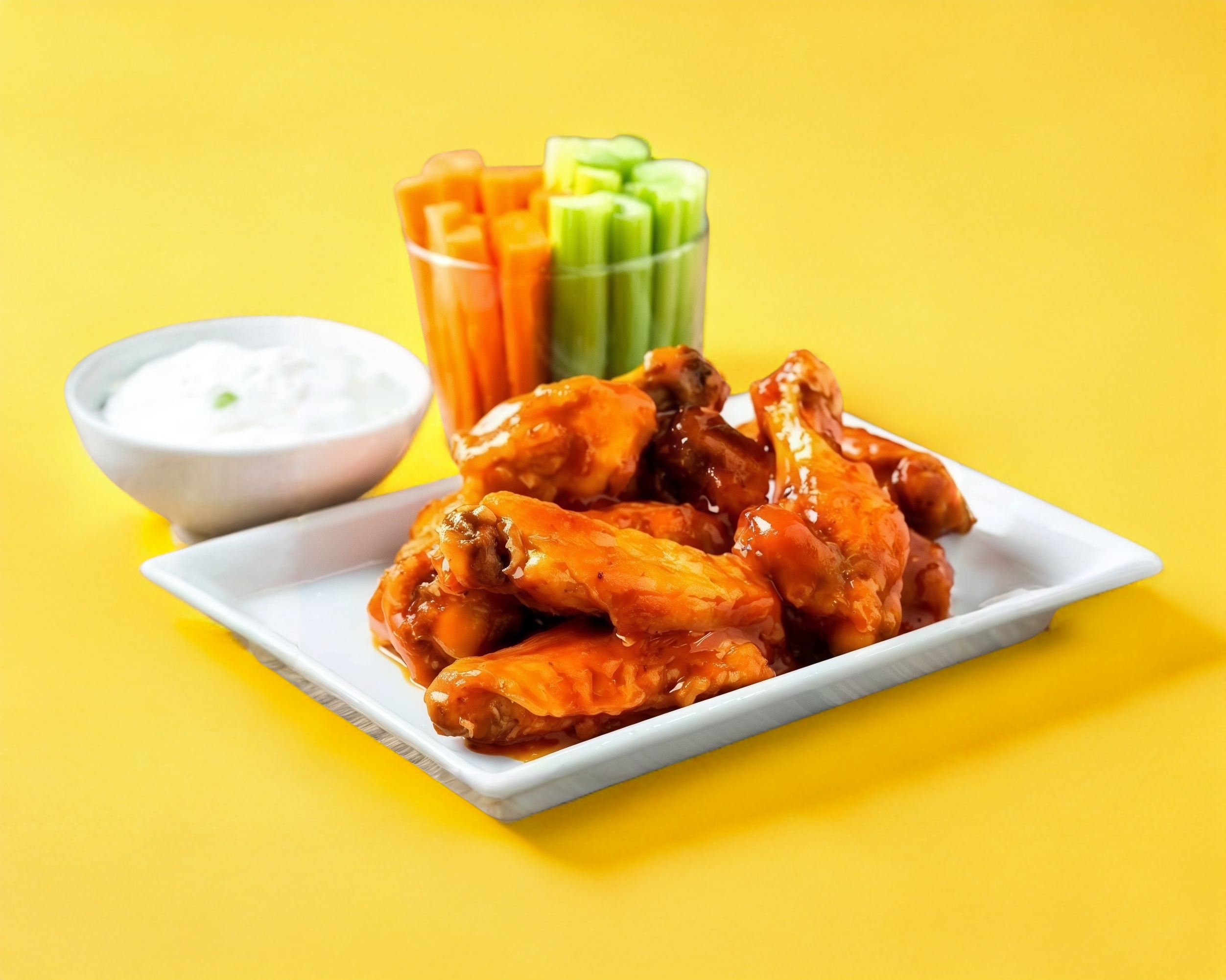 alitas de pollo marinadas, bañadas en 1 o 2 salsas a elegir, ranch, bastones de zanahoria y apio organicos. (500gr).