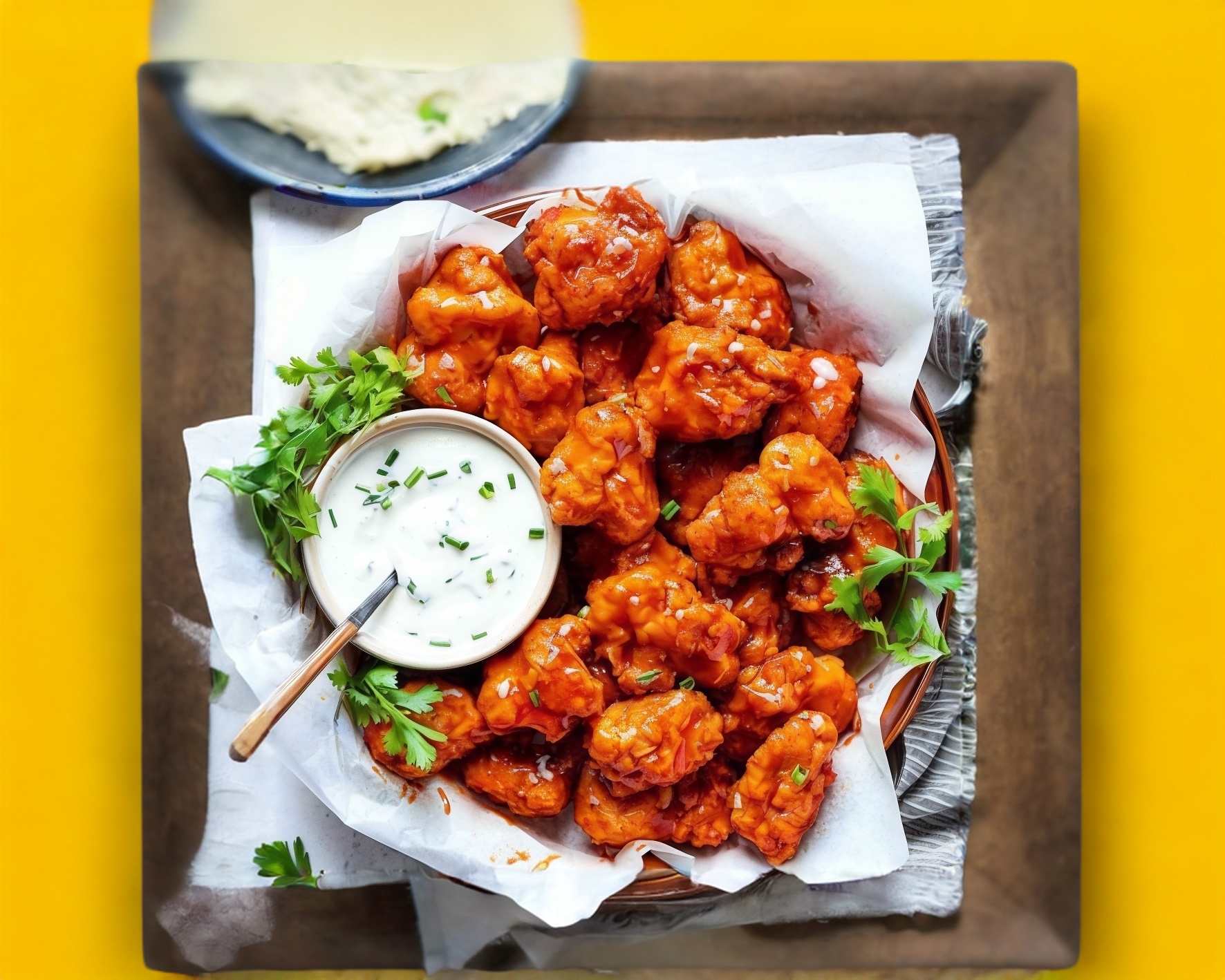Trozos de pechuga premium empanizados, bañados hasta en 3 salsas a elegir + 2 ranch + bastones de zanahoria y apio orgánicos (950gr)
