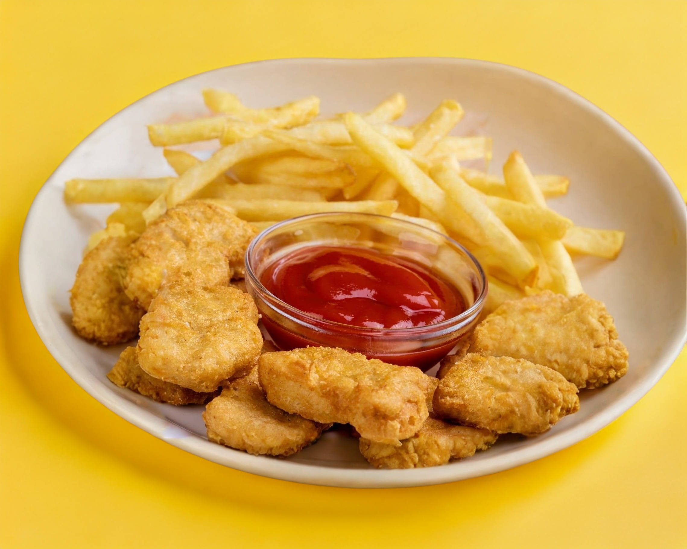 Nuggets de pollo empanizado 10 piezas + papas fritas a elegir y agua natural de sabor 500ml