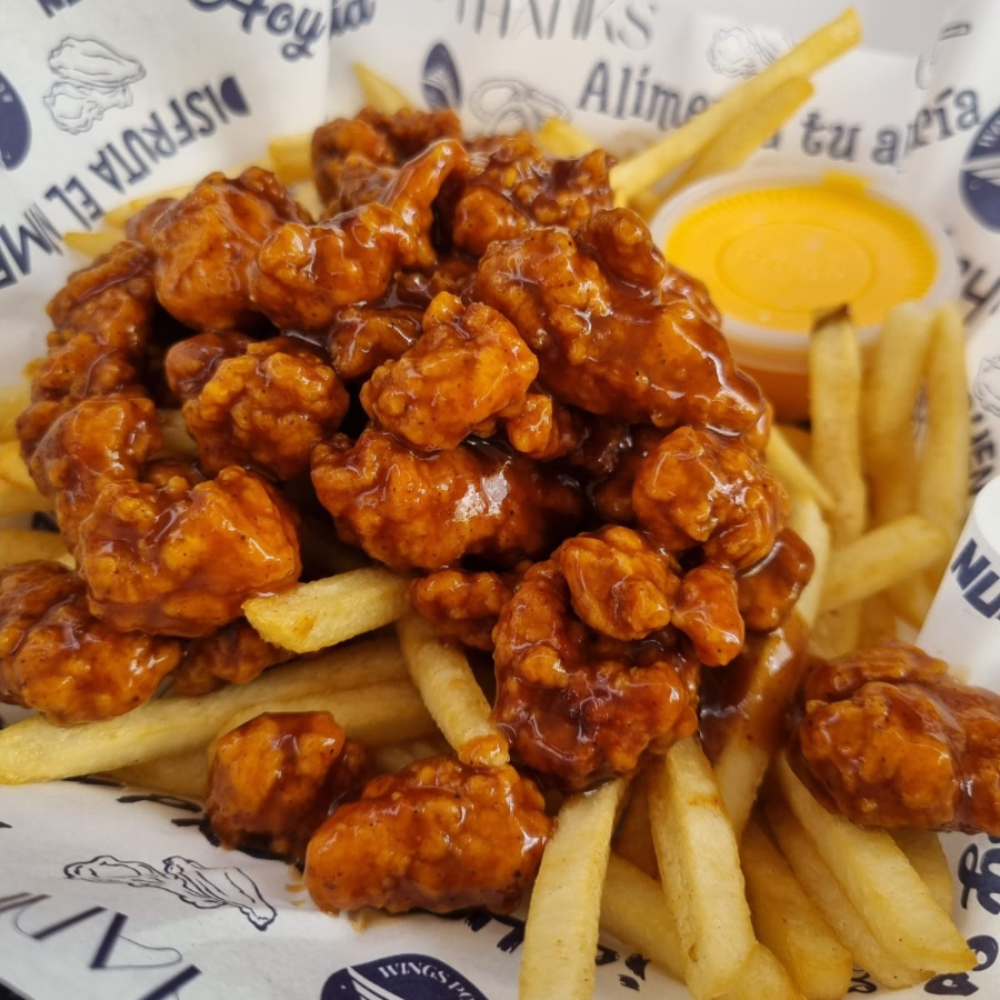 cama de papas fritas, cubiertas de Mini boneless perfectos para botanear cubiertos de tu salsa favorita. incluye queso amarillo