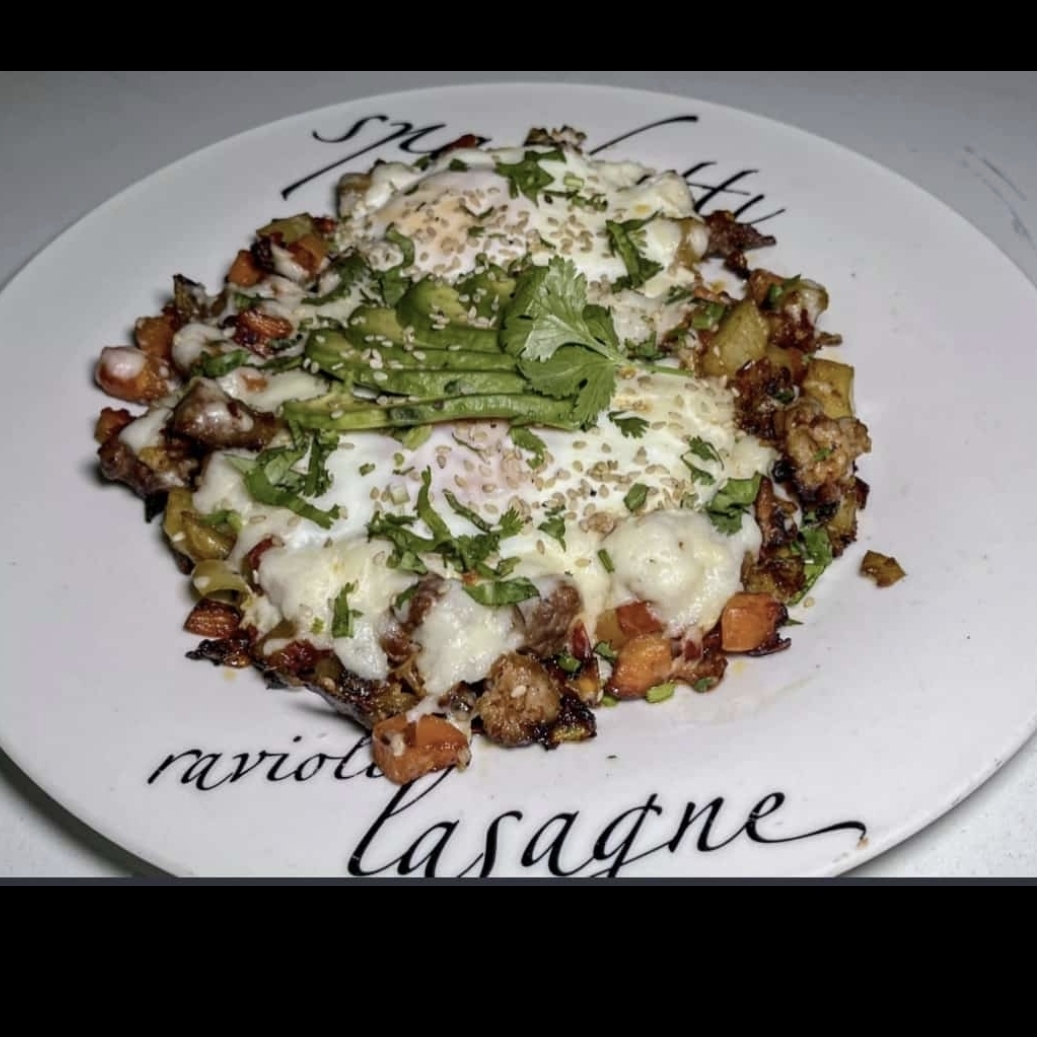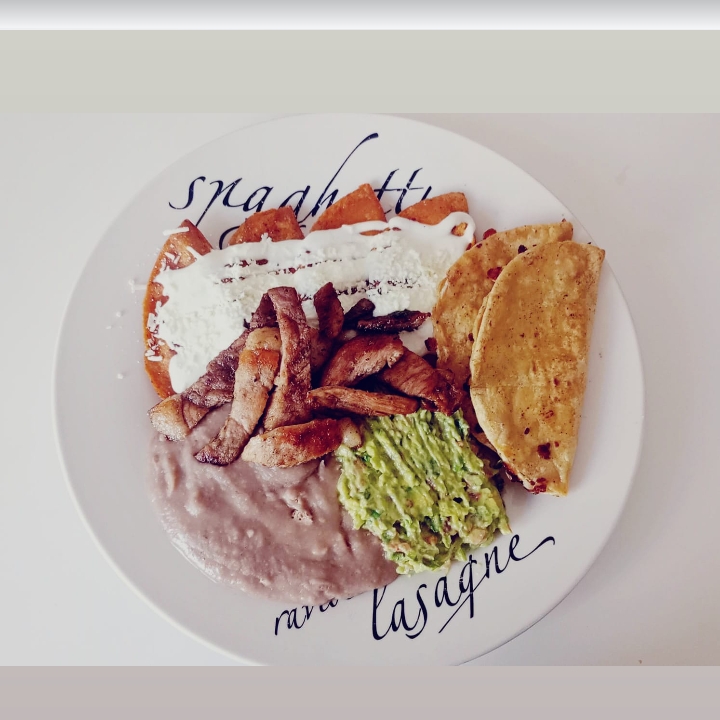 Jugosa carne asada con papa y zanahoria. Acompañado de: pico de gallo, queso asadero, 2 piezas de huevo, aguacate, salsa y tortillas.