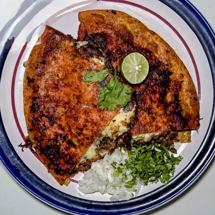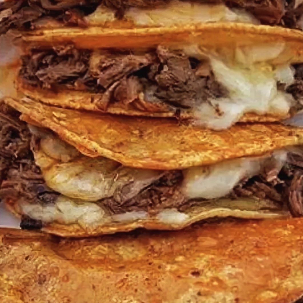 Dos tortillas con queso derretido y la carne a tu elección: bistec, chorizo, barbacoa, machitos y campechano.