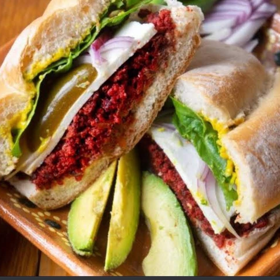 Torta con delicioso chorizo, queso panela, lechuga, jitomate, aguacate y chiles en vinagre.