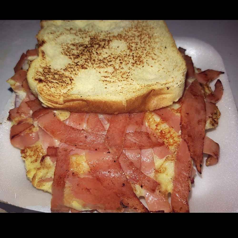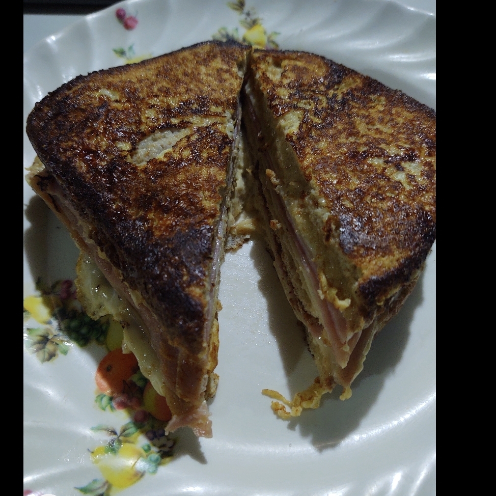 Tres piezas de pan con aderezo, jamón, queso manchego triple y canela. Un sándwich dulce y salado.