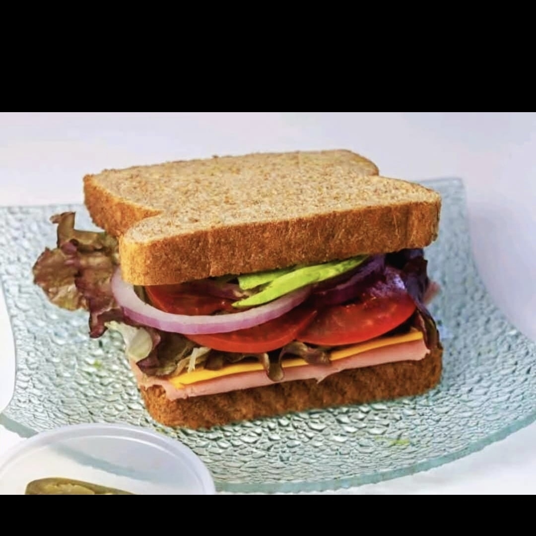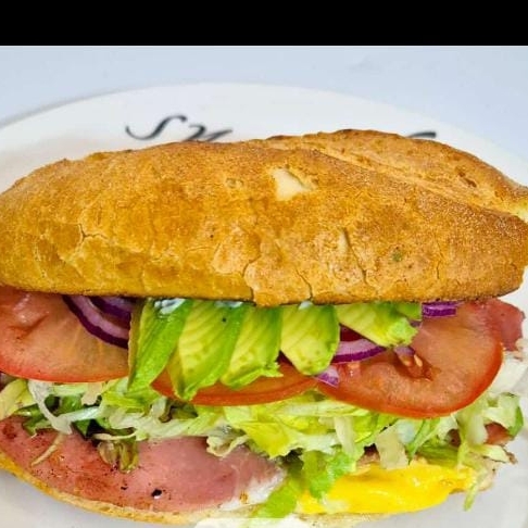 Sándwich con aderezo, jamón, queso amarillo, lechuga, jitomate, cebolla, queso blanco, aguacate y chiles en vinagre.