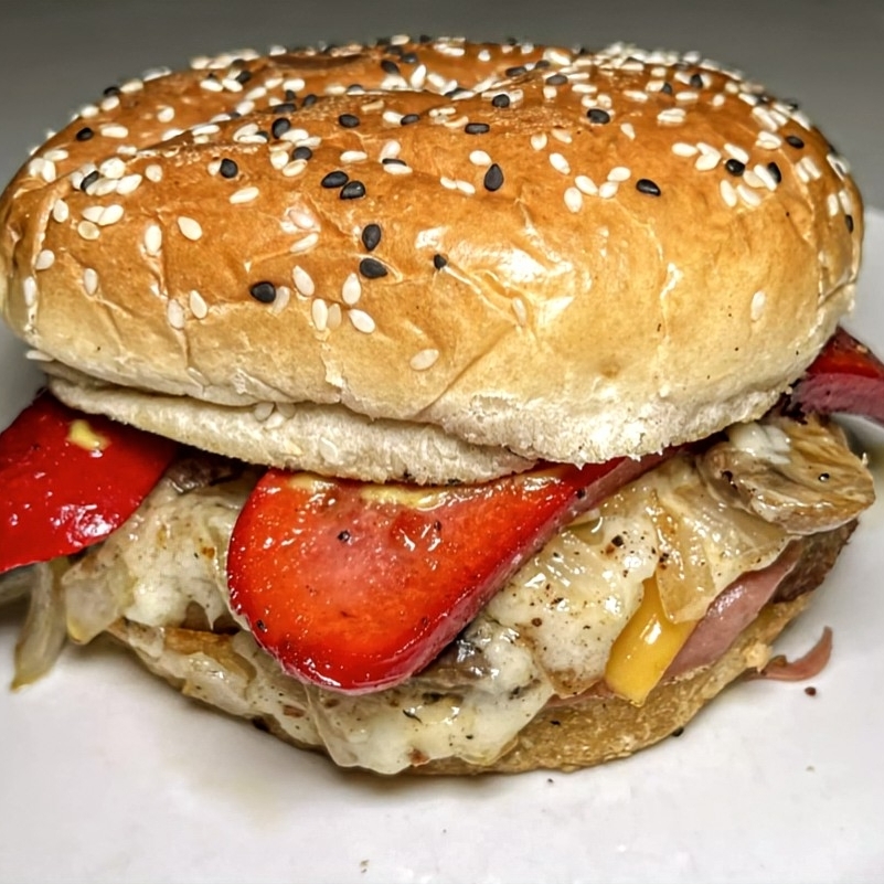Hamburguesa de res grande con jamón, quesos, tocino, cebolla asada, champiñones, salchicha para asar, aderezos y chiles en vinagre.