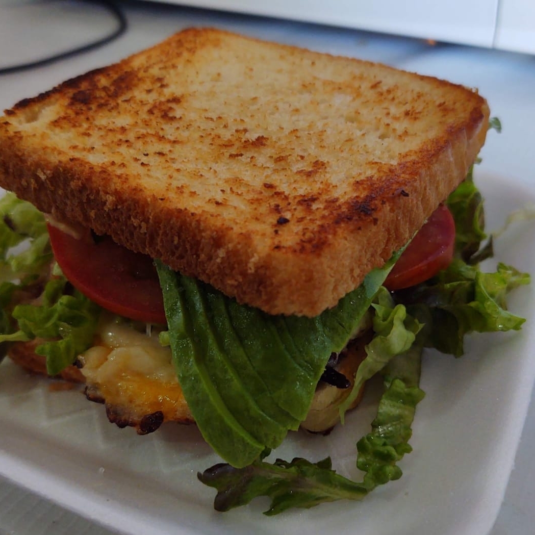 Sándwich con milanesa de pollo, aderezo, lechuga, jitomate, cebolla y aguacate.