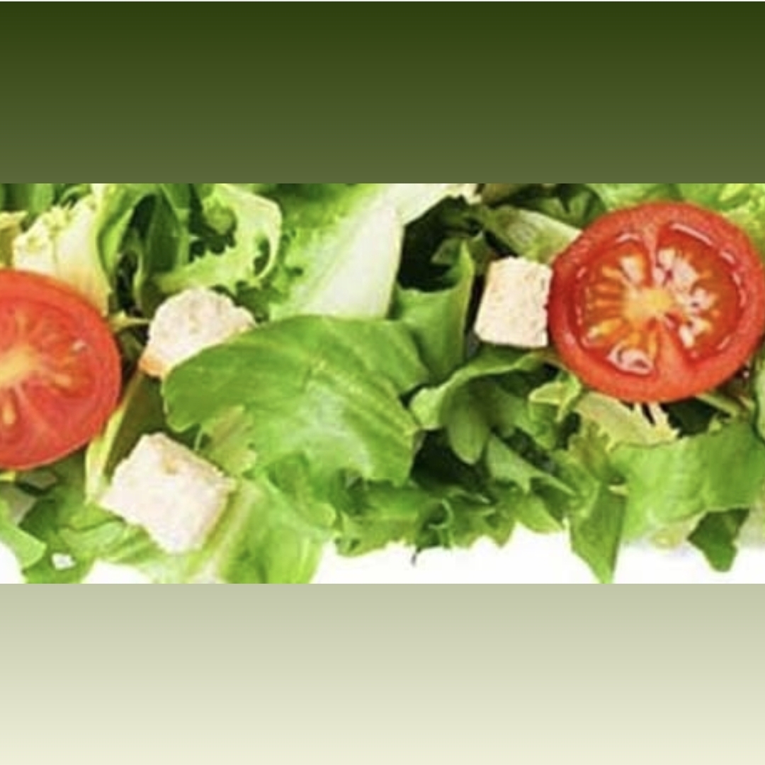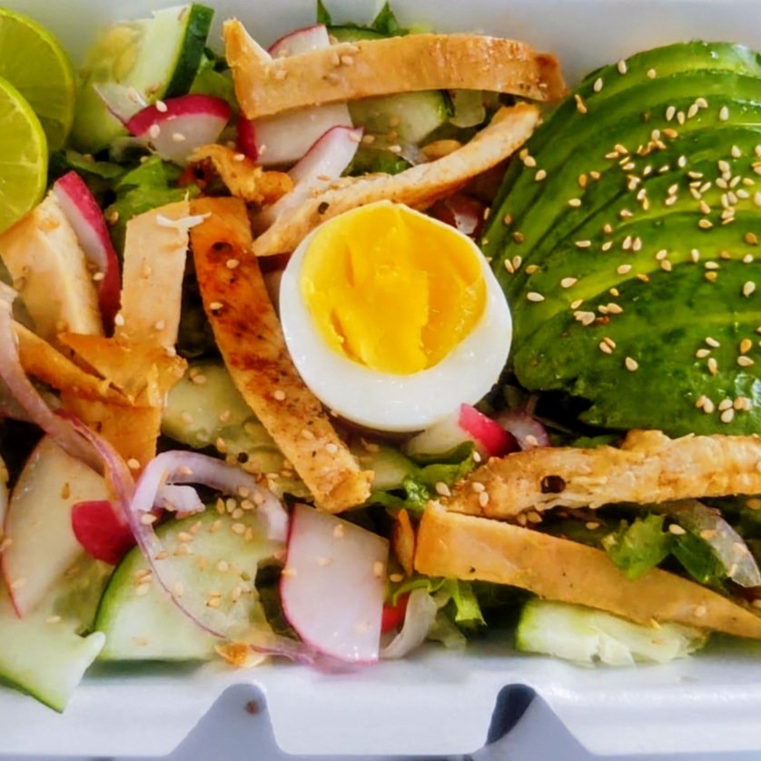 Ensalada fresca con lechuga, pechuga de pollo, huevo cocido, jitomate, cebolla, jícama, zanahoria, pepino, ajonjolí, aceite de oliva, aguacate y aderezo.