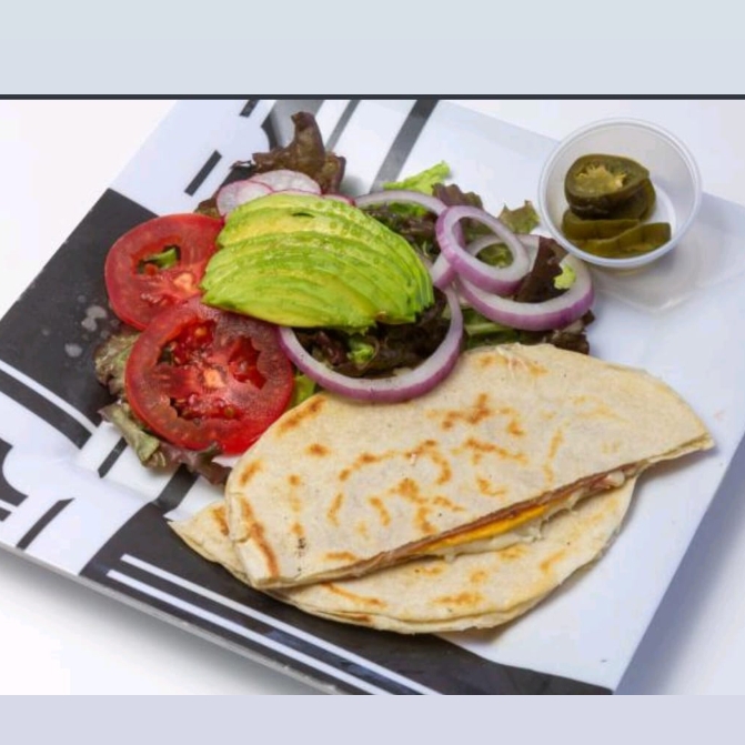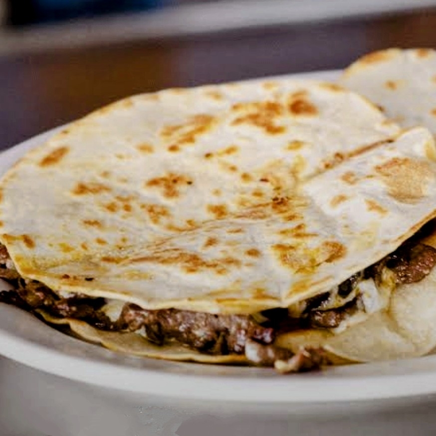 Enorme quesadilla rellena con queso y la carne a tu elección: bistec, chorizo, barbacoa o campechana.
