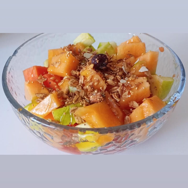 Combinación fresca de manzana, papaya, plátano y melón, coronada con granola. Acompañado de tu elección de: miel, lechera o yogur.