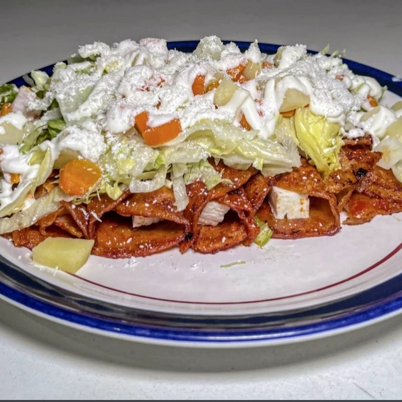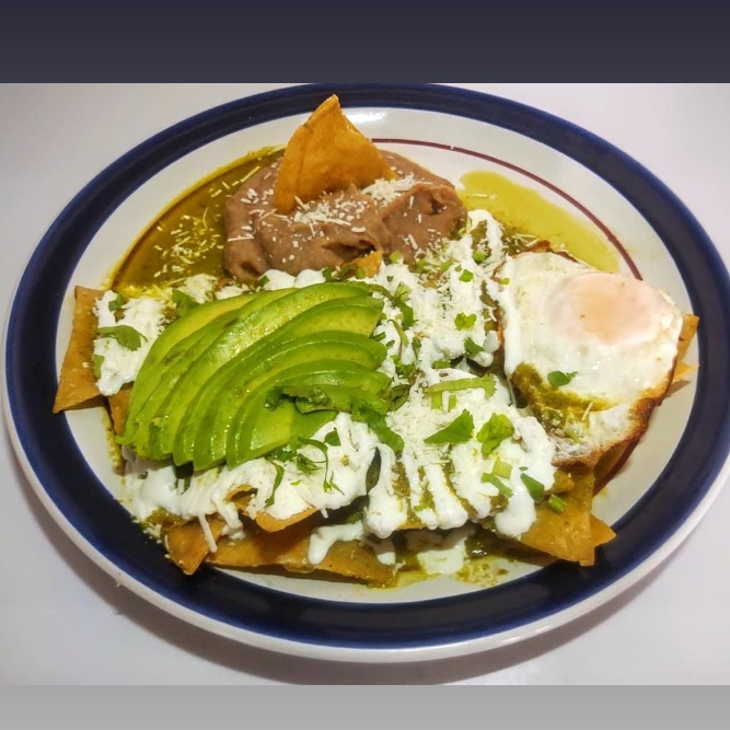 Totopos bañados en una rica salsa de poblano, frijoles, cebolla, cilantro, queso, crema, aguacate y tu elección de pollo o huevo. Incluye bolillo, salsa y cubiertos.