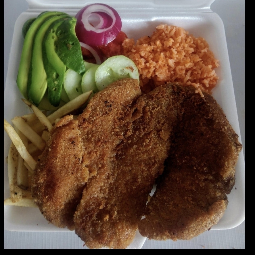 Filete de pescado empanizado, crujiente por fuera y suave por dentro. Acompañado de: arroz, ensalada y papas a la francesa. Incluye tostada, galleta salada, salsa, limón y cátsup.
