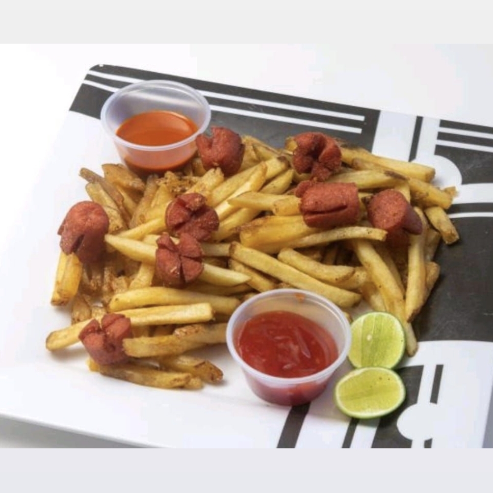 Papas a la francesa servidas con salchicha en rodajas.