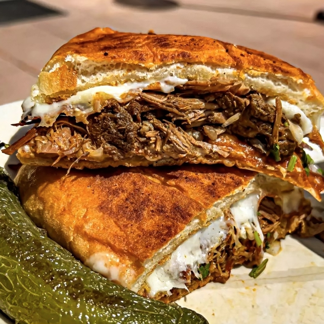 Exquisito bolillo bañado en chile rojo, relleno de queso y barbacoa. ¡un platillo único!