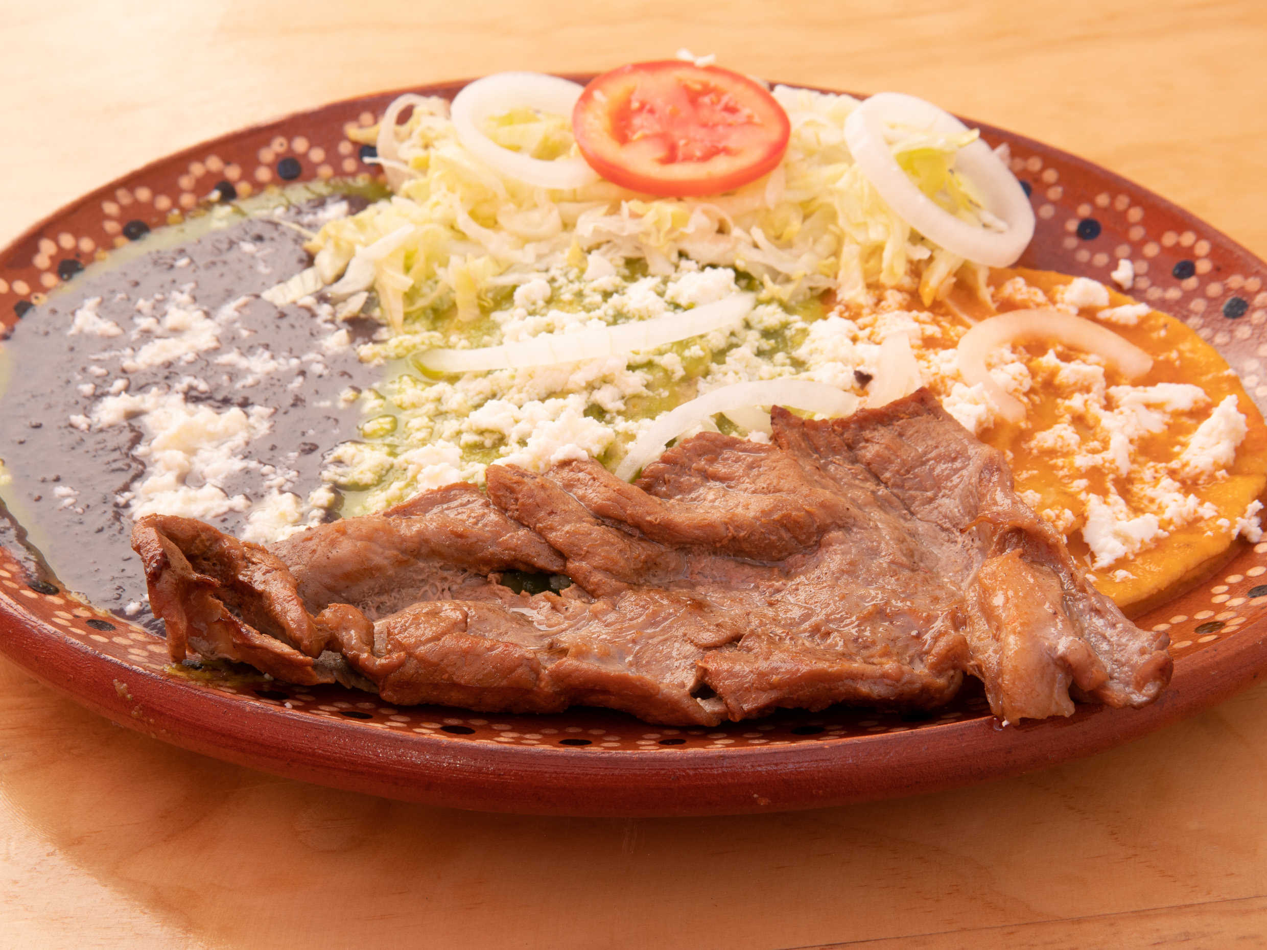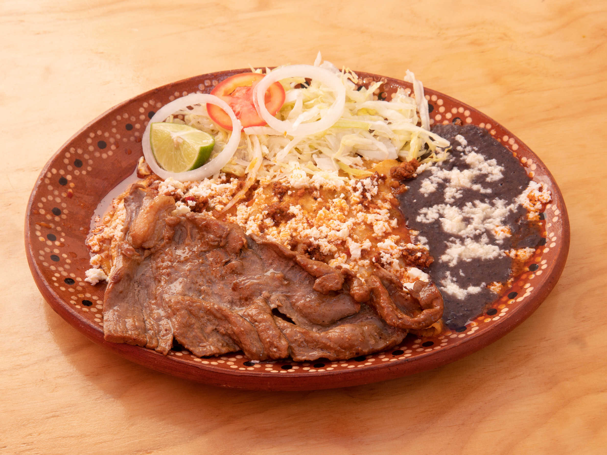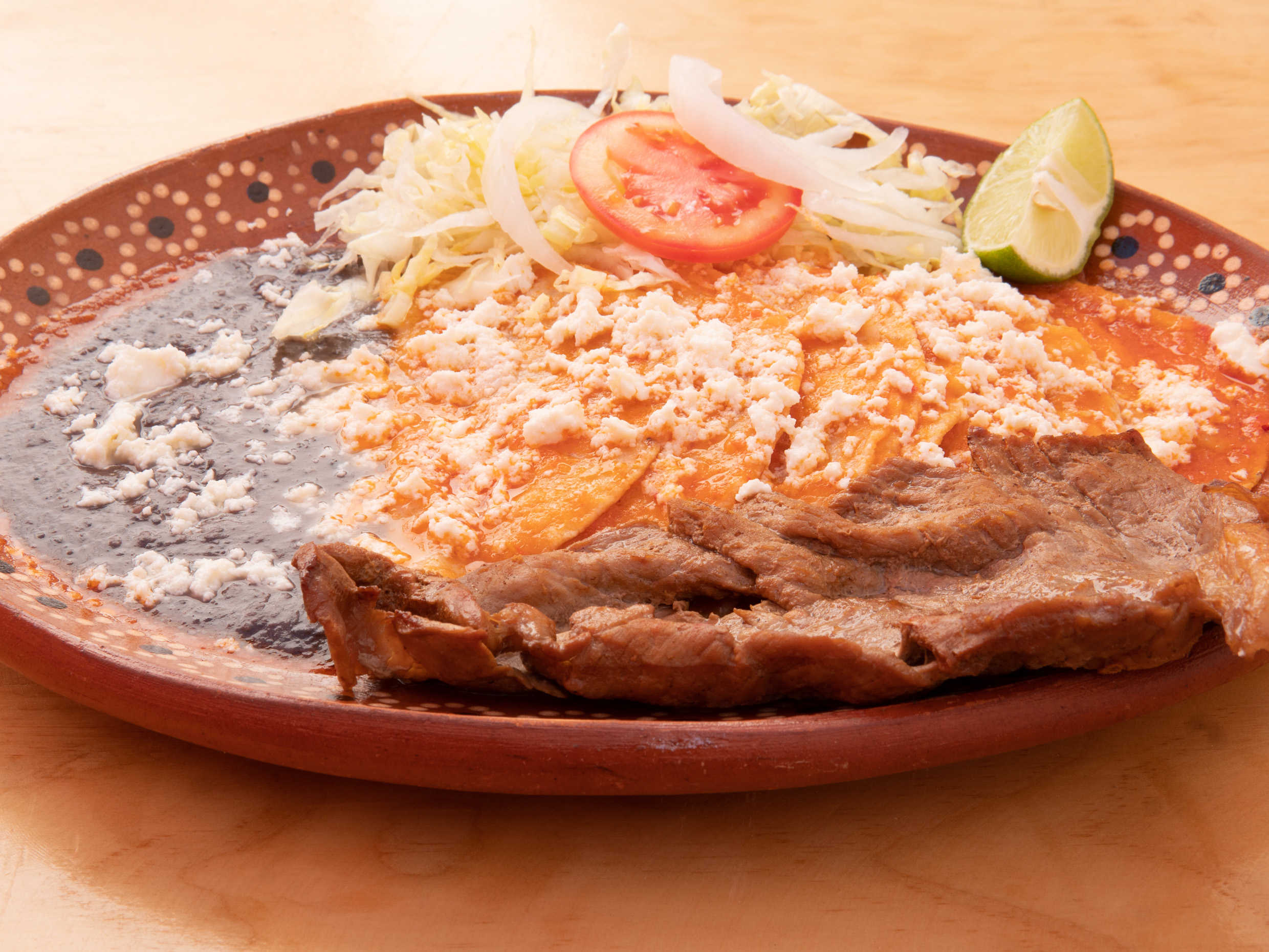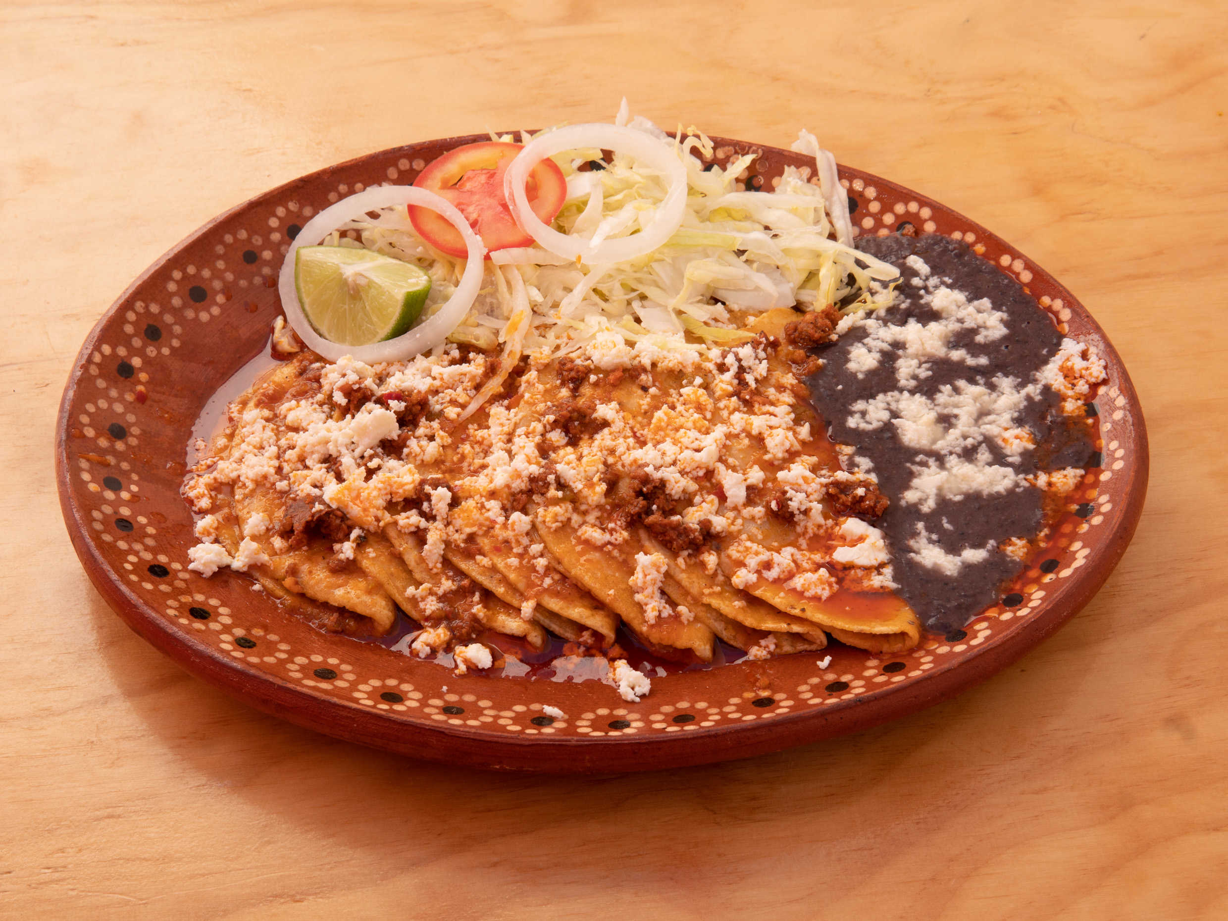 6 enchiladas, frijoles negros, ensalada, queso y cecina