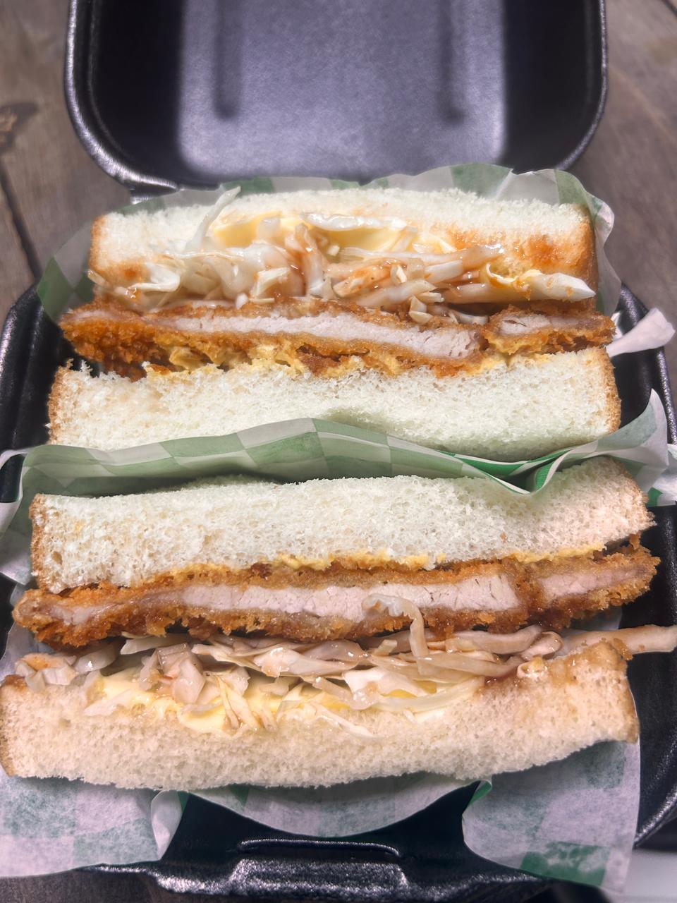 Delicioso sandwich de lomo de cerdo empanizado con panko, con repollo, mostaza y salsa bulldog