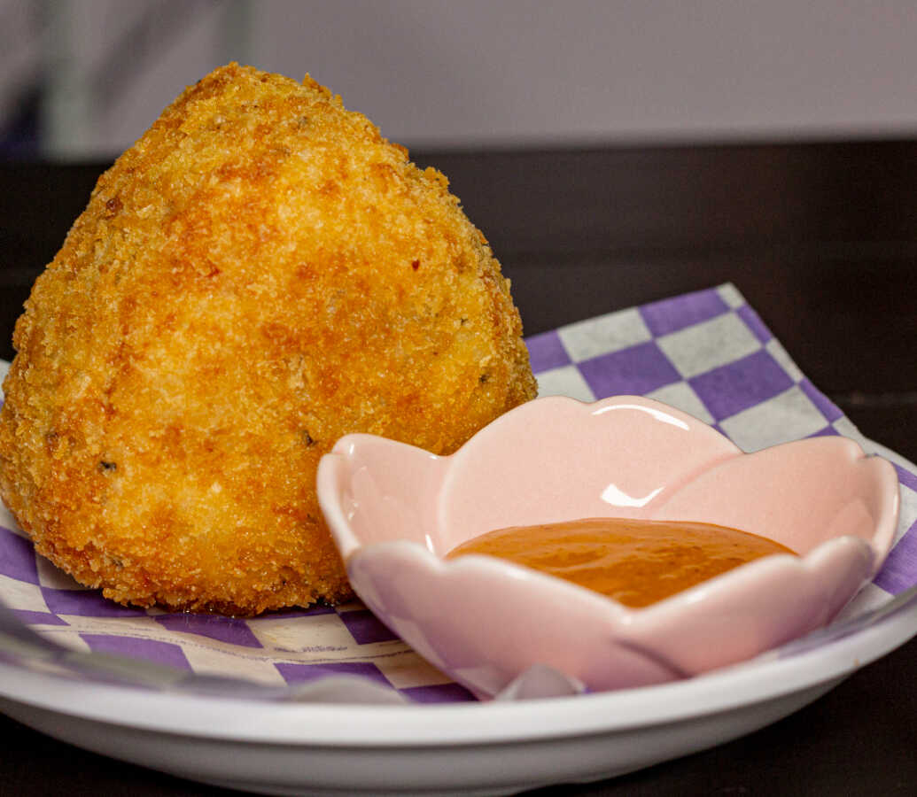 Crujiente Onigiri empanizado con panko, relleno de un queso a elegir. Acompañado de salsa cremosa de chipotle y soya.