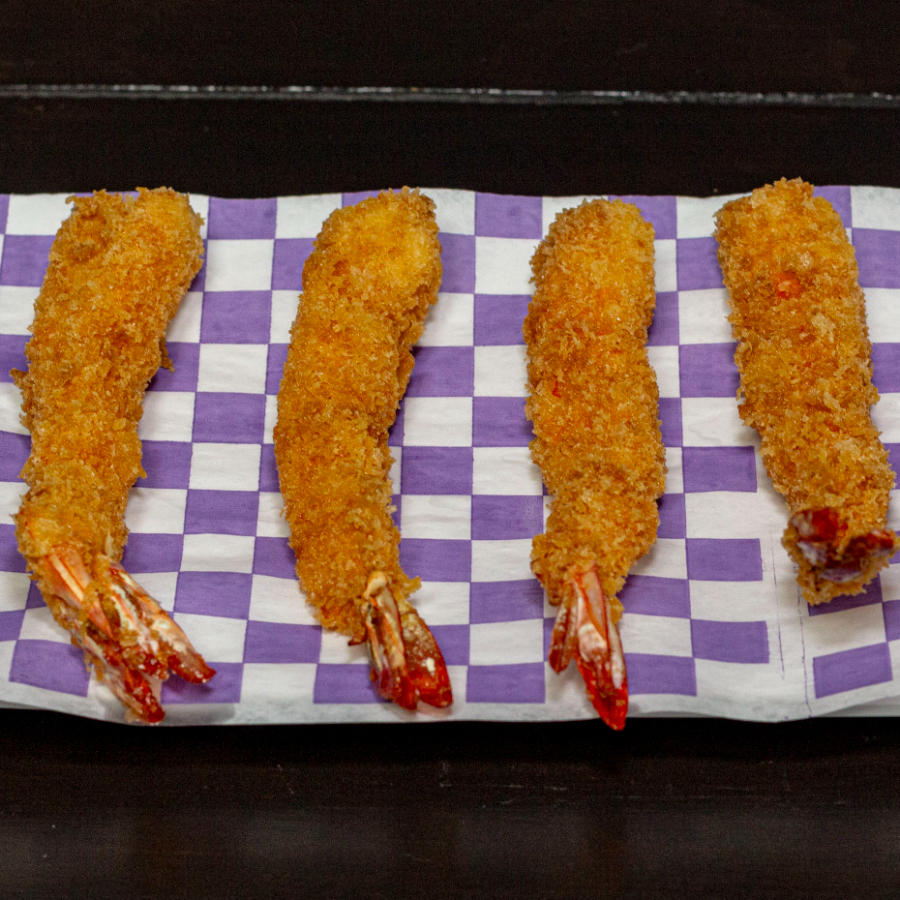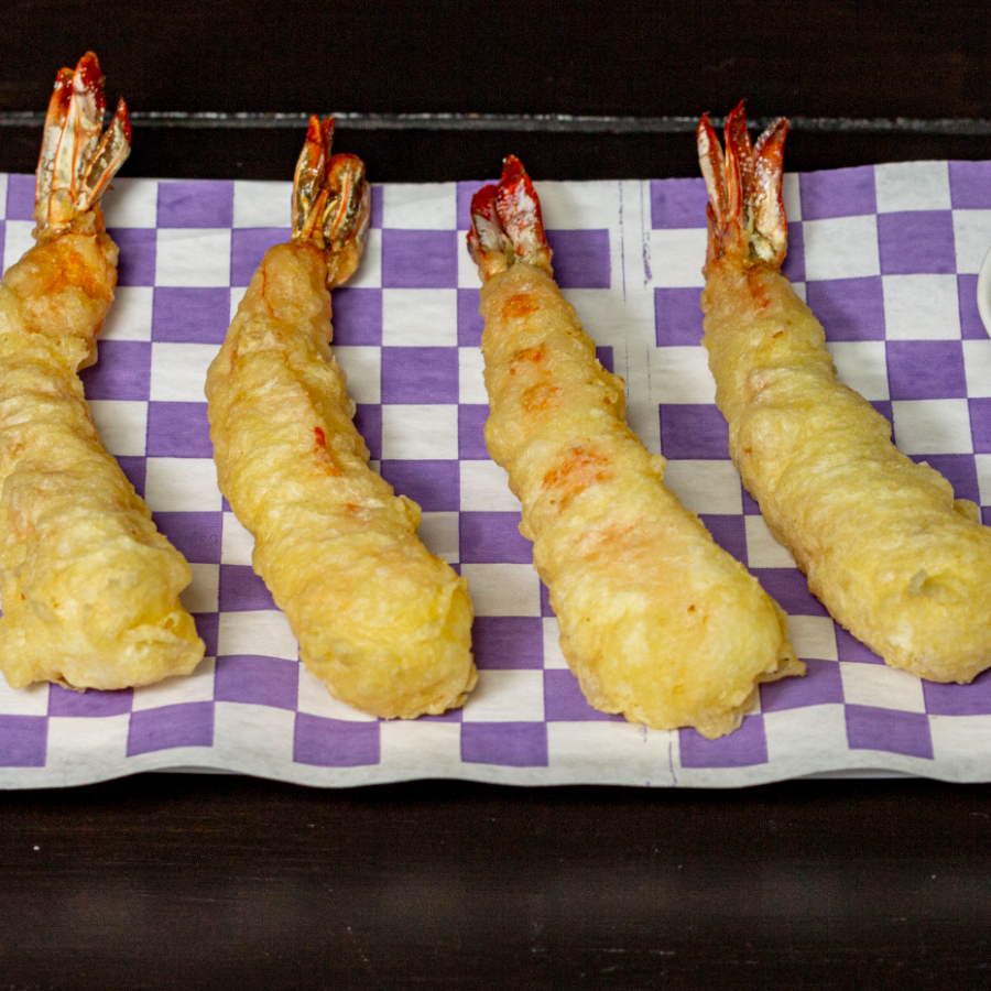 4 camarones grandes rebozados en tempura, servidos con salsa tentsuyu tradicional.