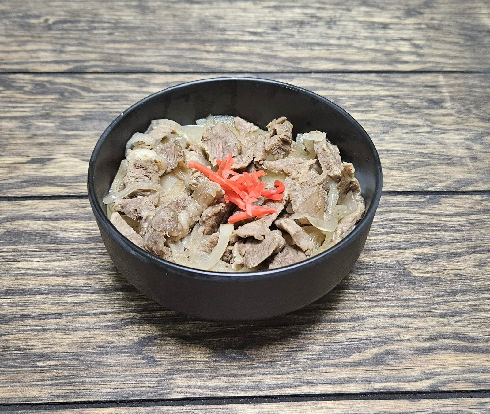 Tazón de arroz cubierto de finas láminas de carne de res y cebolla cocinadas en salsa dulce.