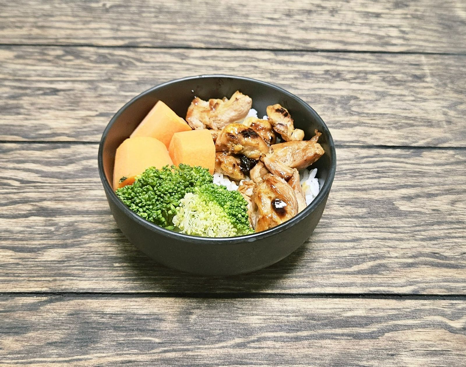 Tazón de arroz con pollo bañado en salsa teriyaki agridulce.